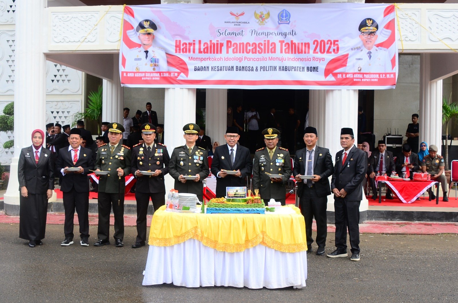 BONE – Usai pelaksanaan upacara Hari Lahir Pancasila di halaman kantor Bupati Bone, Dandim 1407/Bone, Letkol Inf Laode Muhammad Idrus, menerima kejutan nasi tumpeng dari Pemerintah Daerah (Pemda) Bone. Kejutan tersebut diberikan dalam rangka memperingati Hari Ulang Tahun (HUT) Kodam XIV Hasanuddin yang ke-68. Minggu(01/06/2025)