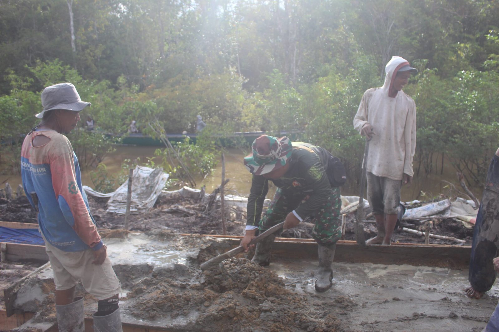 Cuaca yang terkadang panas terik dan medan yang sulit dilalui tidak menyurutkan semangat mereka. Dengan tekad kuat, Satgas dan warga bahu-membahu mengaduk serta mengaplikasikan material cor agar proses pembangunan berjalan lancar.