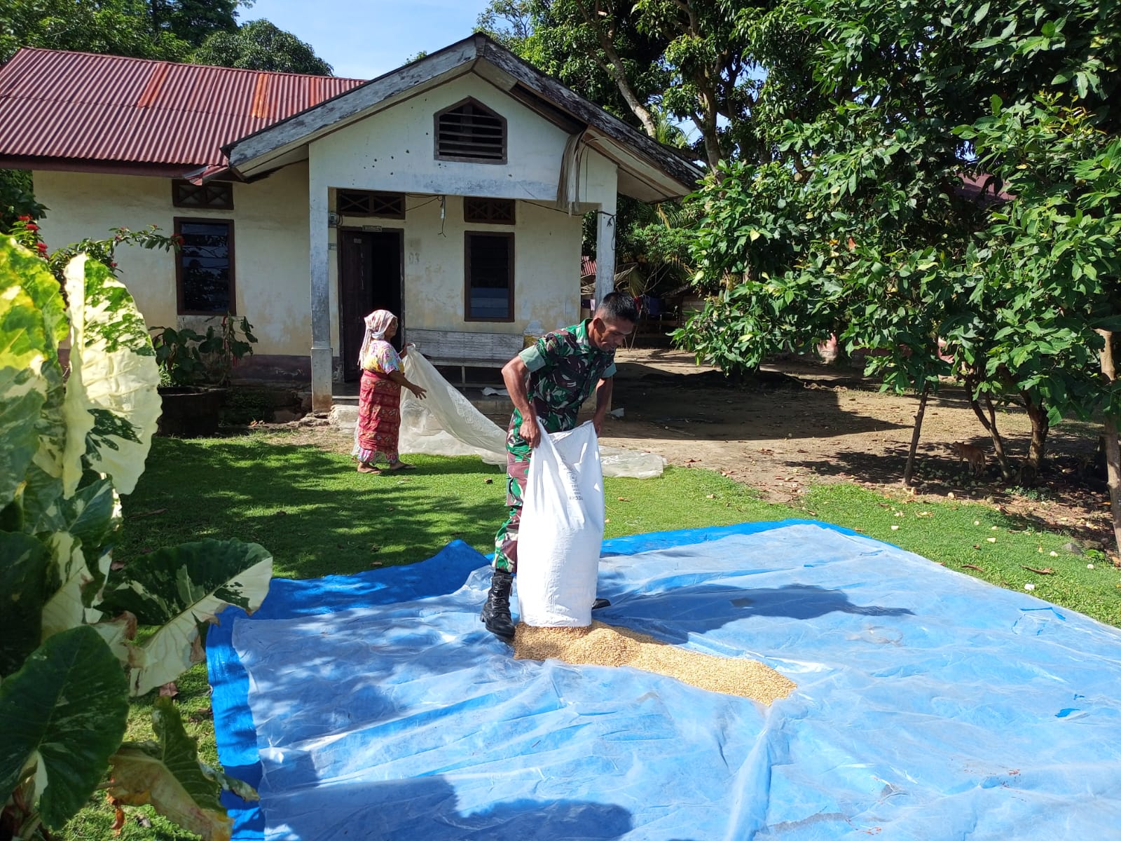 Dalam kegiatan tersebut, Sertu Faisal membantu Ibu Fatimah (65) menjemur padi hasil panen agar cepat kering dan siap untuk diproses lebih lanjut. Pendampingan ini dilakukan sebagai bentuk kepedulian Babinsa terhadap kesulitan warga, khususnya dalam mendukung aktivitas pertanian masyarakat di desa binaannya.