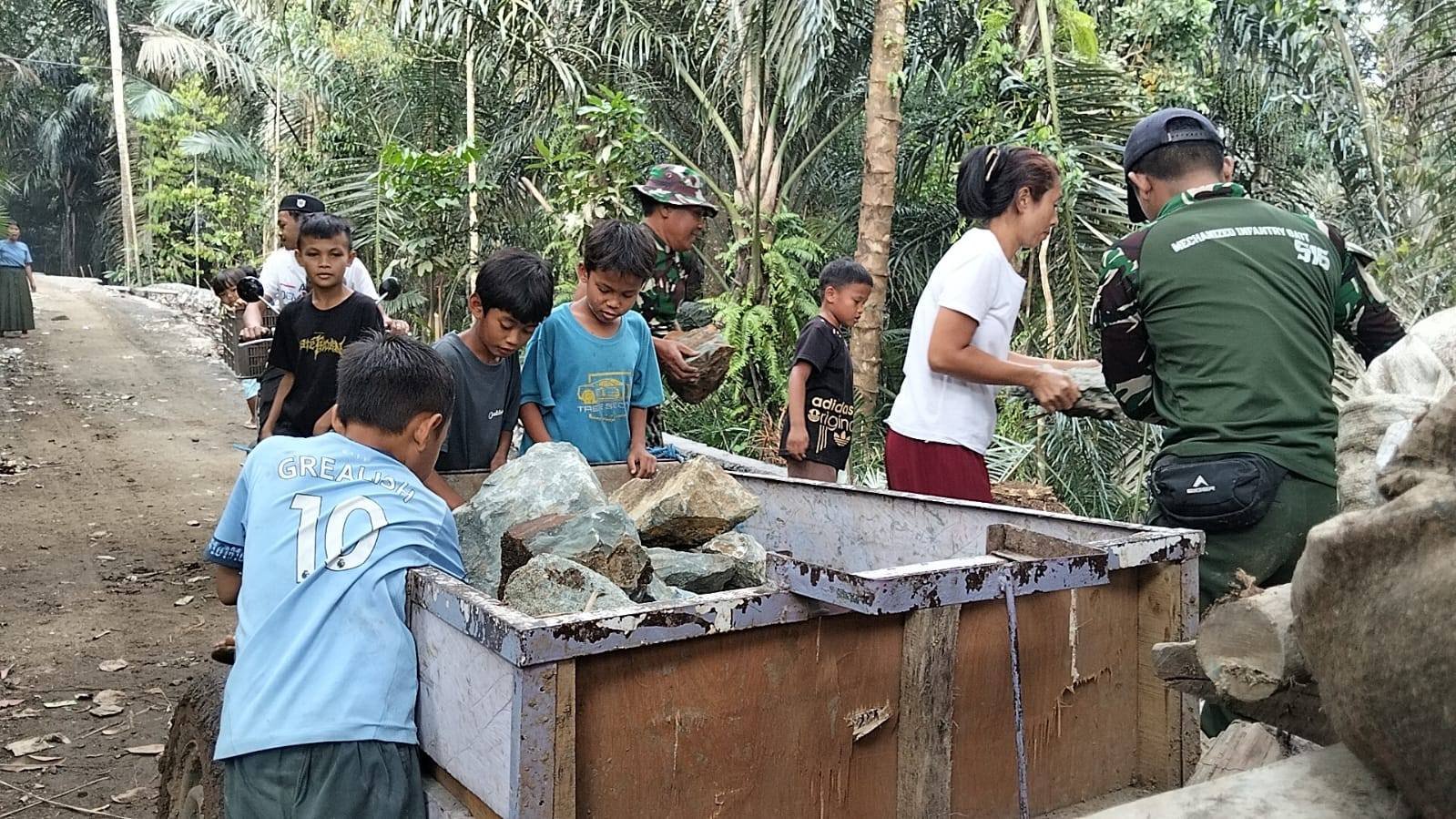 Di bawah terik matahari, tampak anak-anak bersama orang tua mereka menurunkan batu satu per satu dari traktor. Meski sederhana, kebersamaan itu mencerminkan semangat gotong royong yang menjadi ciri khas kegiatan TMMD.