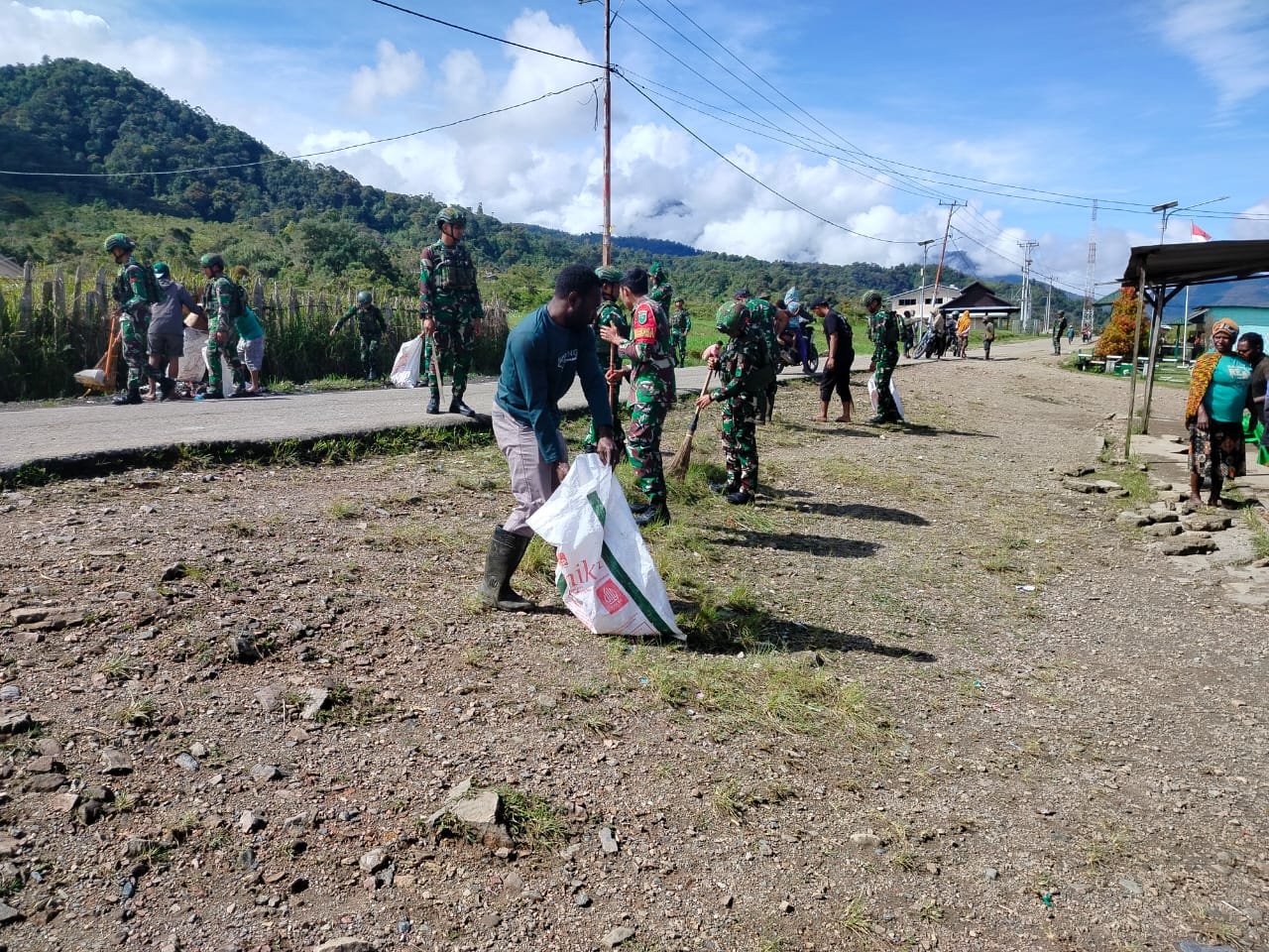 Dalam kegiatan karya bakti atau gotong royong ini,anggota Koramil 1705-06/Mapia bersama masyarakat, saling membantu dalam pembersihan sampah-sampah yang berserakan di seputaran depan kios milik warga setempat,karena apabila terjadi hujan deras,area tersebut akan terjadi genangan air sehingga perlu adanya kegiatan ini untuk membuang air yang menggenang.