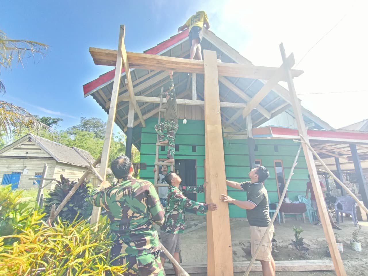 Tonggauna, 03 November 2026 – Setelah hampir satu bulan menumpang tinggal di rumah warga selama melaksanakan tugas TMMD, para anggota Satgas TNI melakukan aksi bakti sosial berupa pengecatan dinding rumah yang mereka gunakan sebagai tempat bermalam.