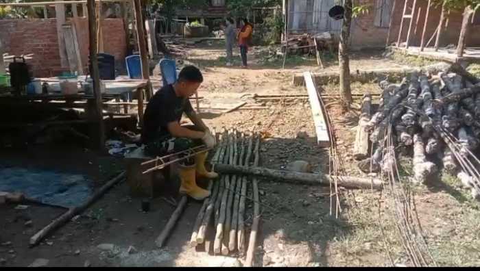 Salah satu anggota Satuan Tugas (Satgas) TNI Manunggal Membangun Desa (TMMD) ke-128 dari Kodim 0405 Lahat, tengah merangkai batangan besi sebagai bagian dari proses pembangunan infrastruktur di wilayah sasaran.