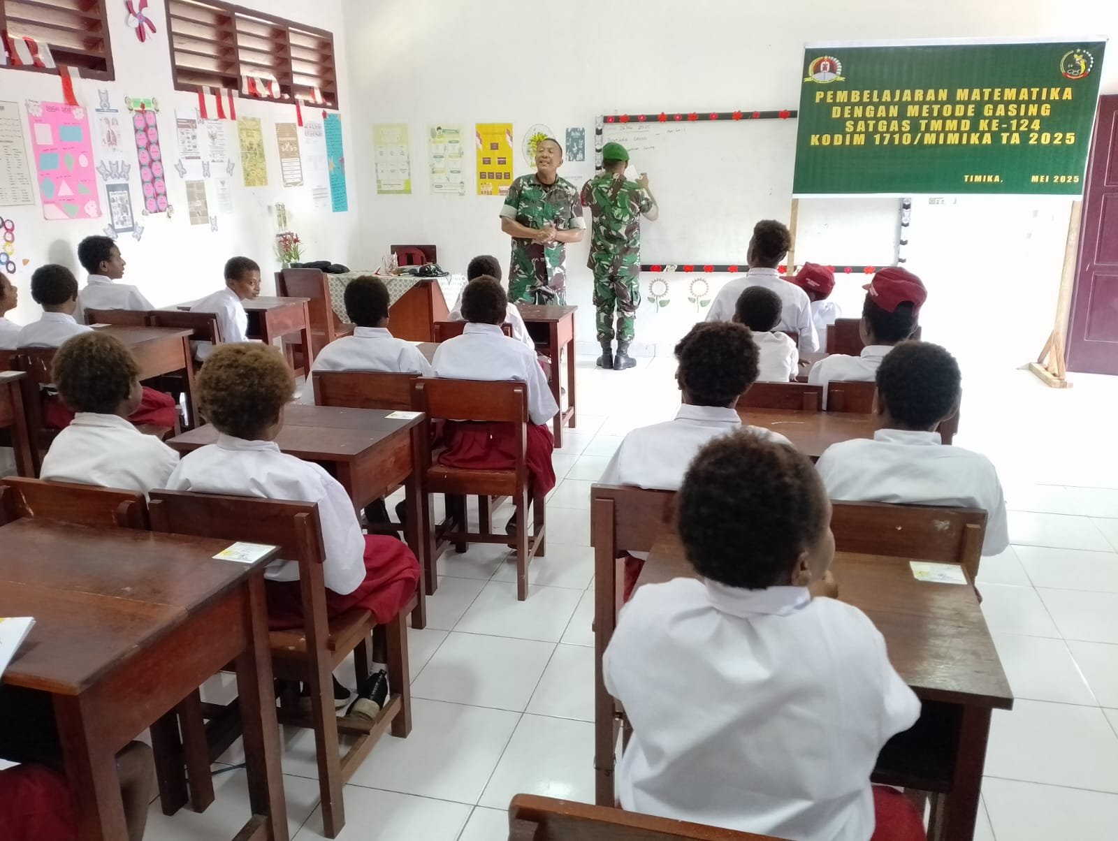 Suasana ceria dan penuh semangat terlihat di SDN Pigapu, Distrik Iwaka, saat Anggota TMMD Kodim 1710/Mimika hadir untuk memberikan pembelajaran Matematika Gasing kepada siswa-siswi Kelas 3. Kegiatan ini menjadi momen istimewa bagi para murid yang antusias menyerap materi dengan cara yang menyenangkan dan berbeda. Senin, 26/5/2025.