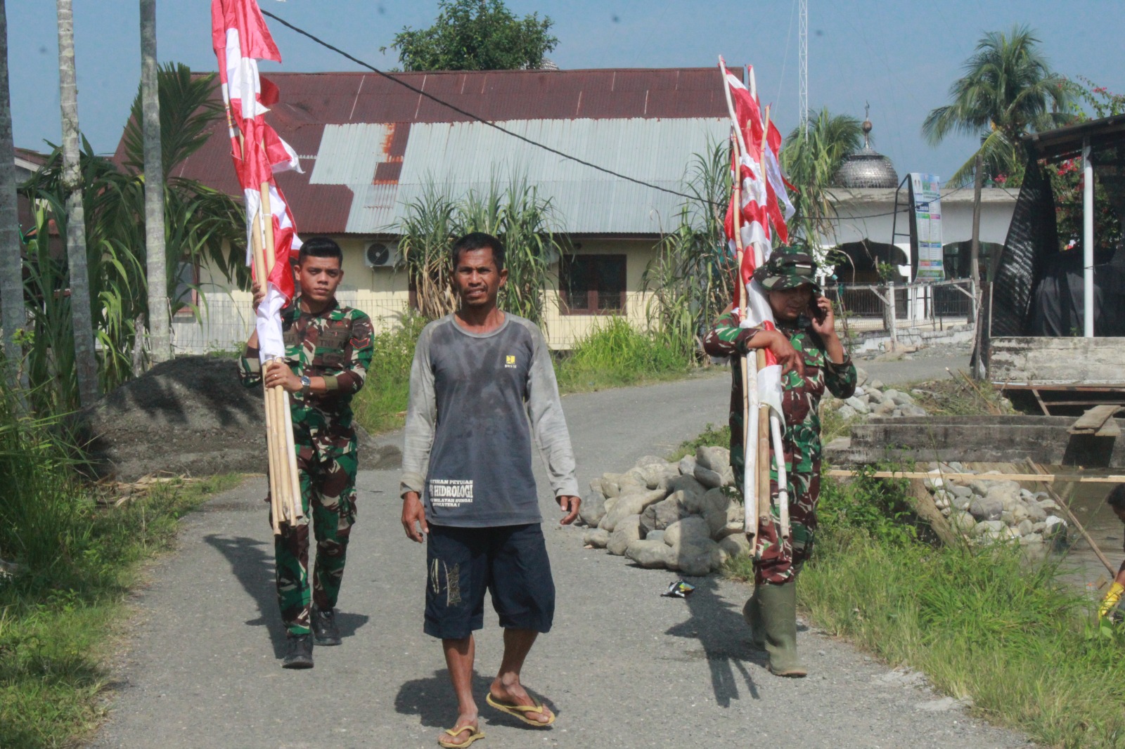 Kegiatan pemasangan umbul-umbul yang berlangsung pada Selasa (10/3/2026) itu menunjukkan antusiasme warga yang turut berpartisipasi bersama anggota satgas.