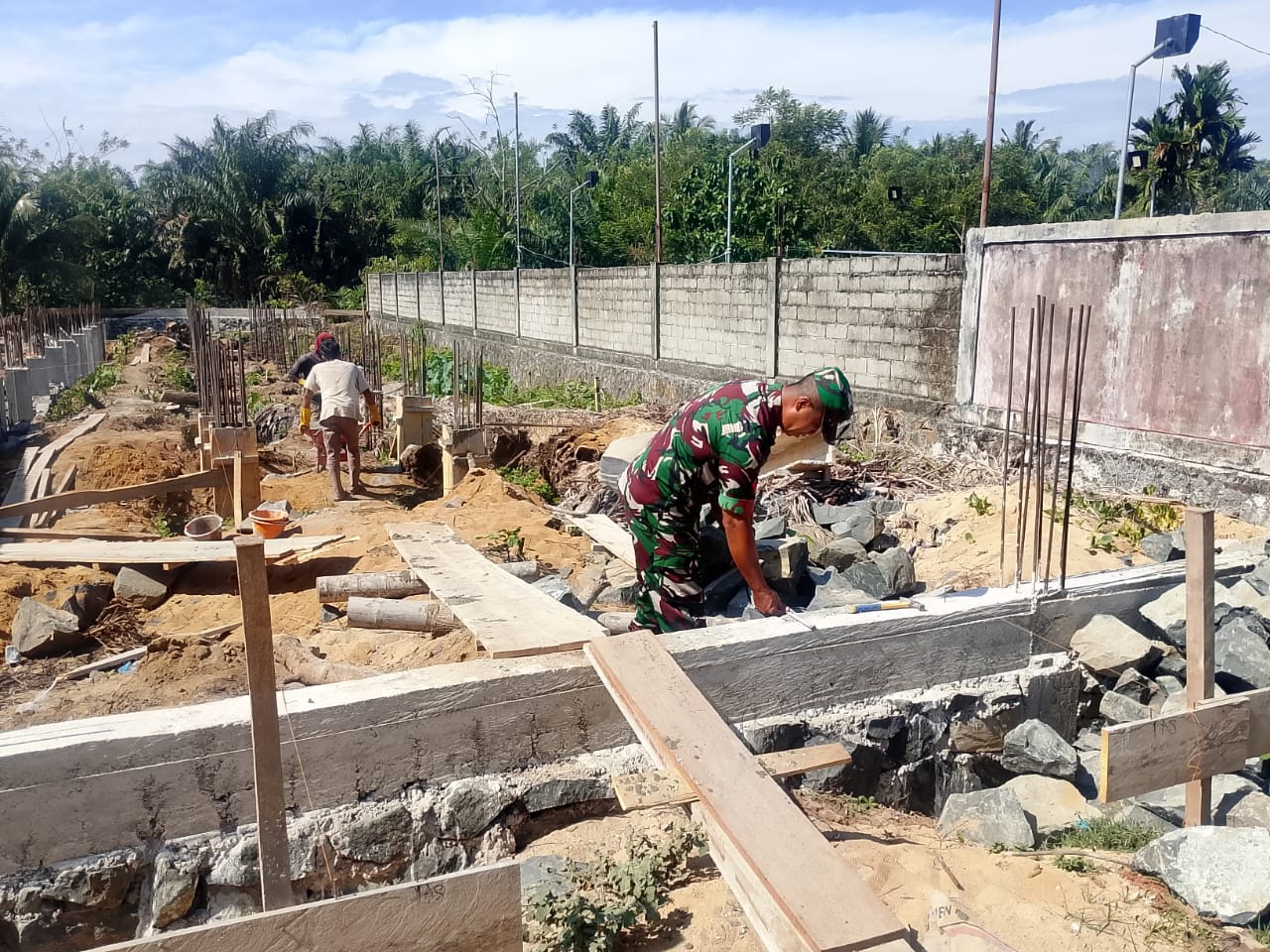 Dalam kegiatan tersebut, Babinsa ikut langsung memasang batu pondasi untuk pembangunan lapangan voli di desa setempat. Kehadiran Babinsa di lapangan menunjukkan kepedulian TNI terhadap masyarakat sekaligus mempererat tali silaturahmi dengan warga binaan.