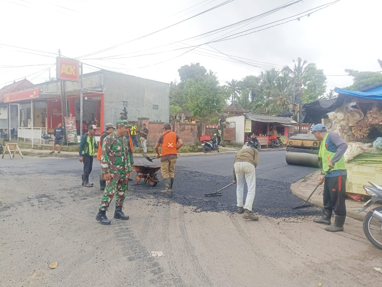 Bangli – Dalam rangka mendukung kelancaran pembangunan infrastruktur jalan di wilayah binaan, Babinsa Desa Bangbang Koramil 1626-03/Tembuku, Pelda Kadek Widiarta, bersama Bhabinkamtibmas melaksanakan pengamanan kegiatan pengaspalan jalan di Desa Bangbang, Kecamatan Tembuku, Kabupaten Bangli, Senin (3/11/2025).
