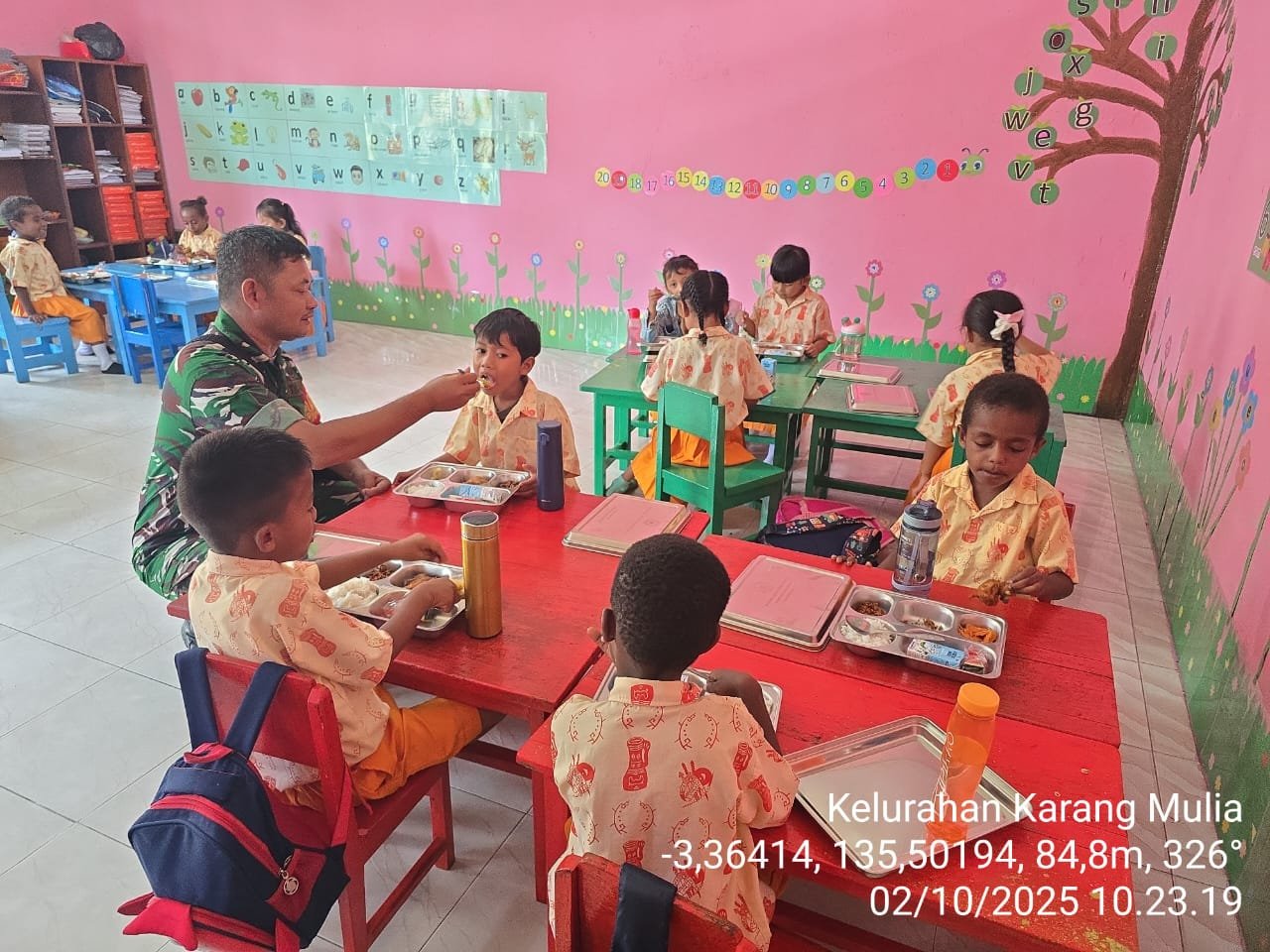 Nabire – Babinsa koramil 1705-01/Nabire Serka Yauji melaksanakan kegiatan monitoring Program Makan Bergizi Gratis (MBG) di TK Pertiwi Jln. Pepera Distrik Nabire, Kabupaten Nabire, Provinsi Papua Tengah, Kamis, (02/10/2025)