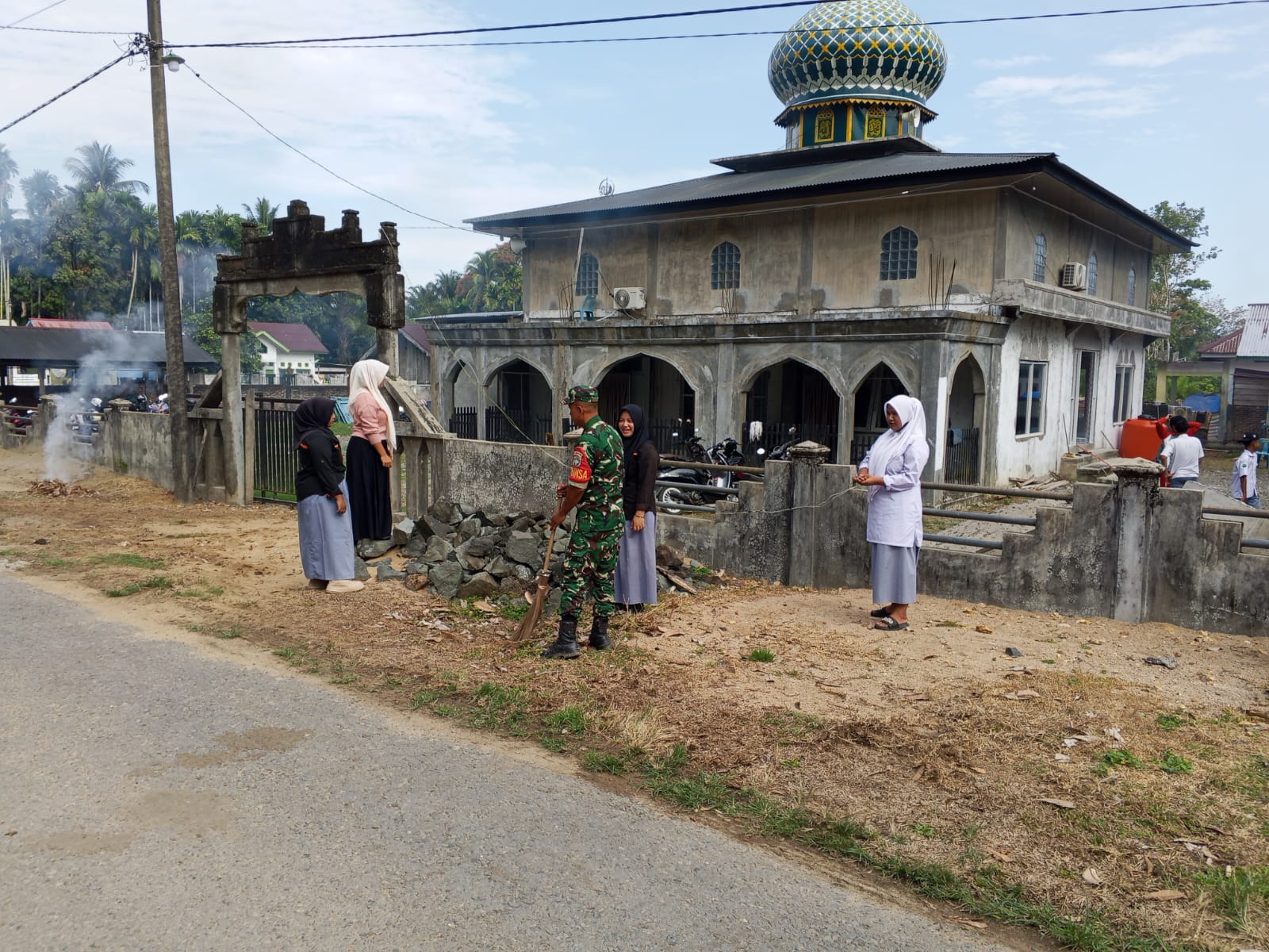 Kegiatan gotong royong ini dilakukan sebagai bentuk kepedulian terhadap kebersihan tempat ibadah sekaligus menumbuhkan semangat kebersamaan antara aparat TNI, pihak sekolah, dan masyarakat.