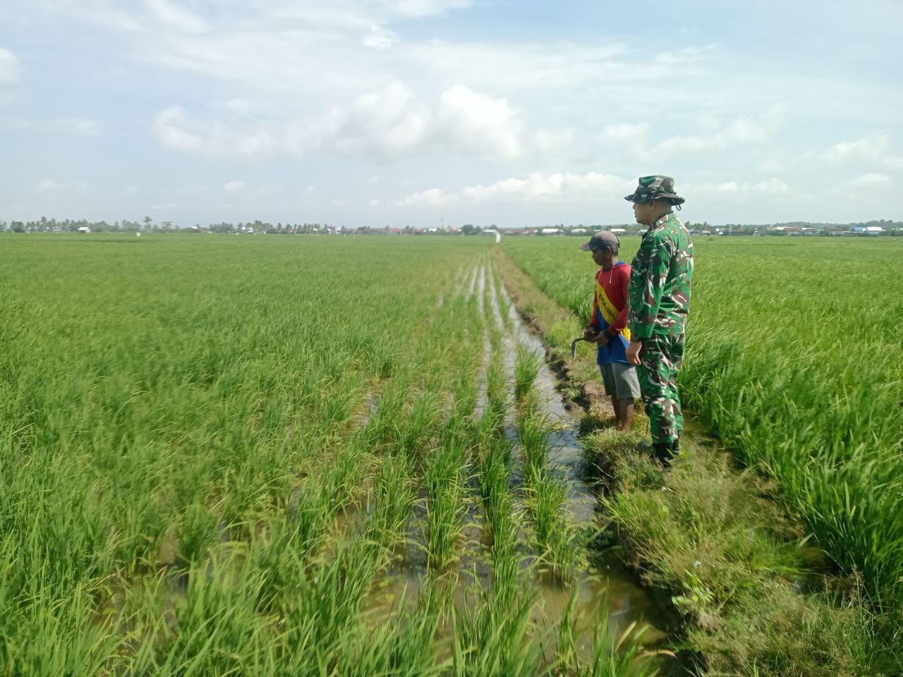 Kegiatan pemantauan ini bertujuan untuk memastikan pertumbuhan tanaman padi berlangsung optimal. Serka Darwis Vera tidak hanya memperhatikan perkembangan fisik tanaman, tetapi juga berinteraksi dengan petani untuk mengantisipasi potensi serangan hama serta memastikan keberlangsungan sistem irigasi di daerah tersebut.