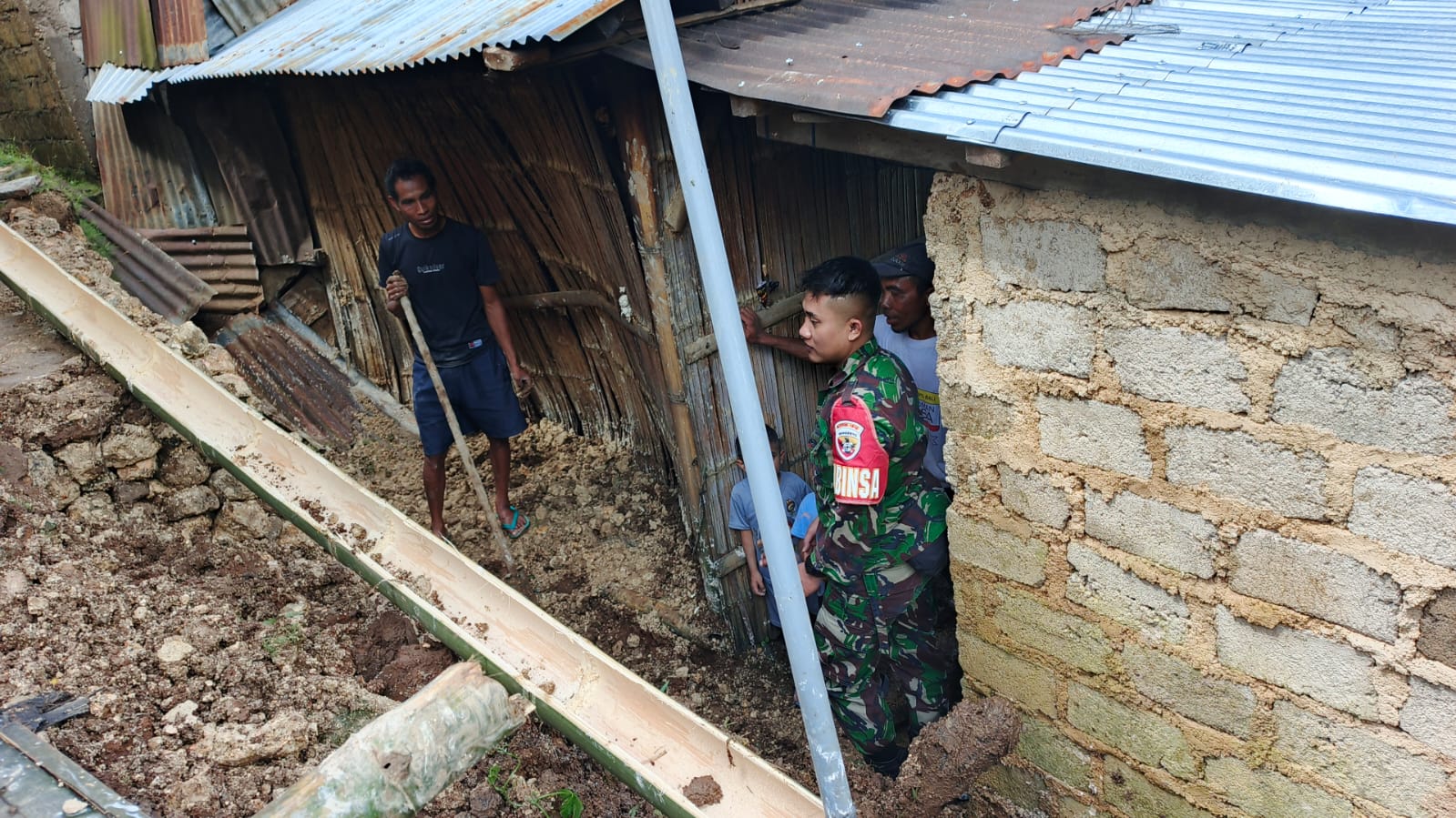Manggarai – Babinsa Koramil 1612-01/Ruteng, Praka M. Saiful, menunjukkan kepeduliannya dengan terjun langsung membantu warga membersihkan material longsor di Desa Gelong, Kecamatan Lelak, Kabupaten Manggarai pada Rabu (8/4/2026).