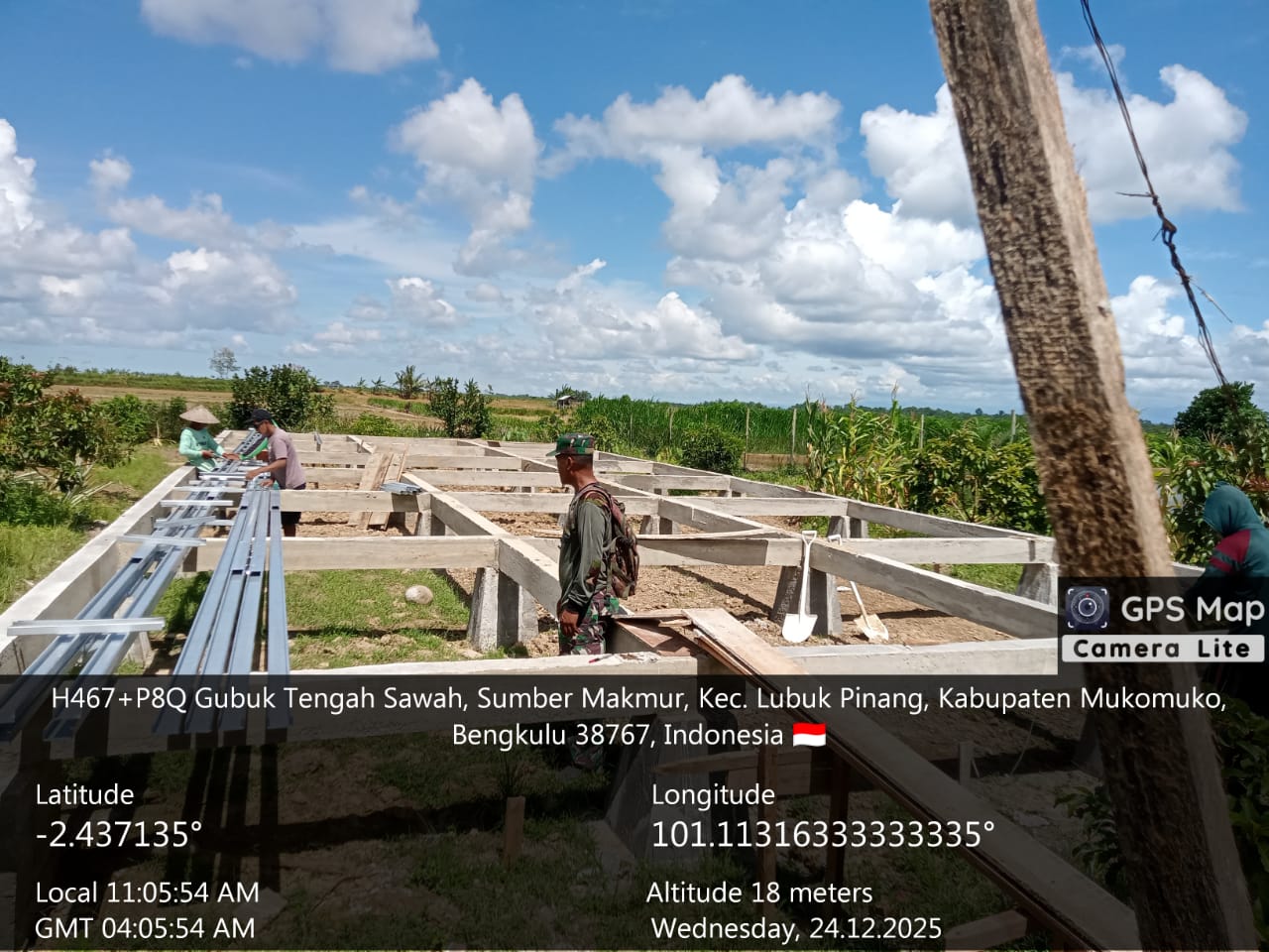 Mukomuko – Pada Rabu, 24 Desember 2025, Babinsa dari Koramil 428-01/Mukomuko, Serda Detot Alpian, melakukan pengawasan terhadap proyek pembangunan toren penampungan air sumur bor dan kandang kambing di Green House Desa Sumber Makmur, Kecamatan Lubuk Pinang, Kabupaten Mukomuko. Pengawasan ini berlangsung dari pukul 09.00 WIB hingga selesai dan merupakan bagian dari upaya TNI AD dalam mendukung pertanian dan peternakan lokal.