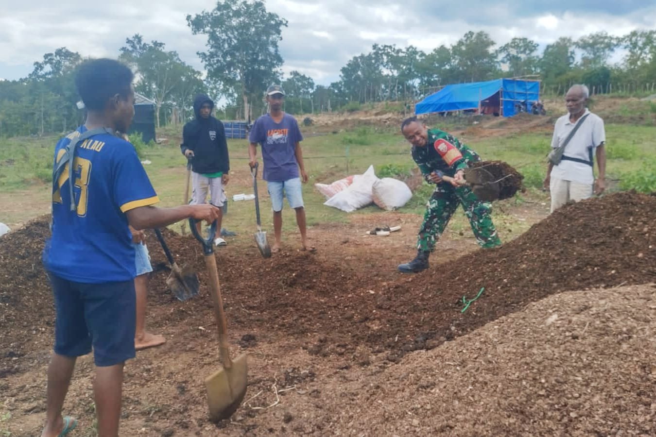 KODIM 1605/BELU, Babinsa Koramil 1605-07/Wedomu Serda Beny Sandli bersama warga masyarakat di wilayah Desa binaannya melakukan proses pengerjaan pembuatan pupuk organik sebagai pengganti pupuk kimia di Dusun Oeoan, Desa Fatuba’a, Kecamatan Tasifeto Timur, Kabupaten Belu, Selasa (20/5/2025).
