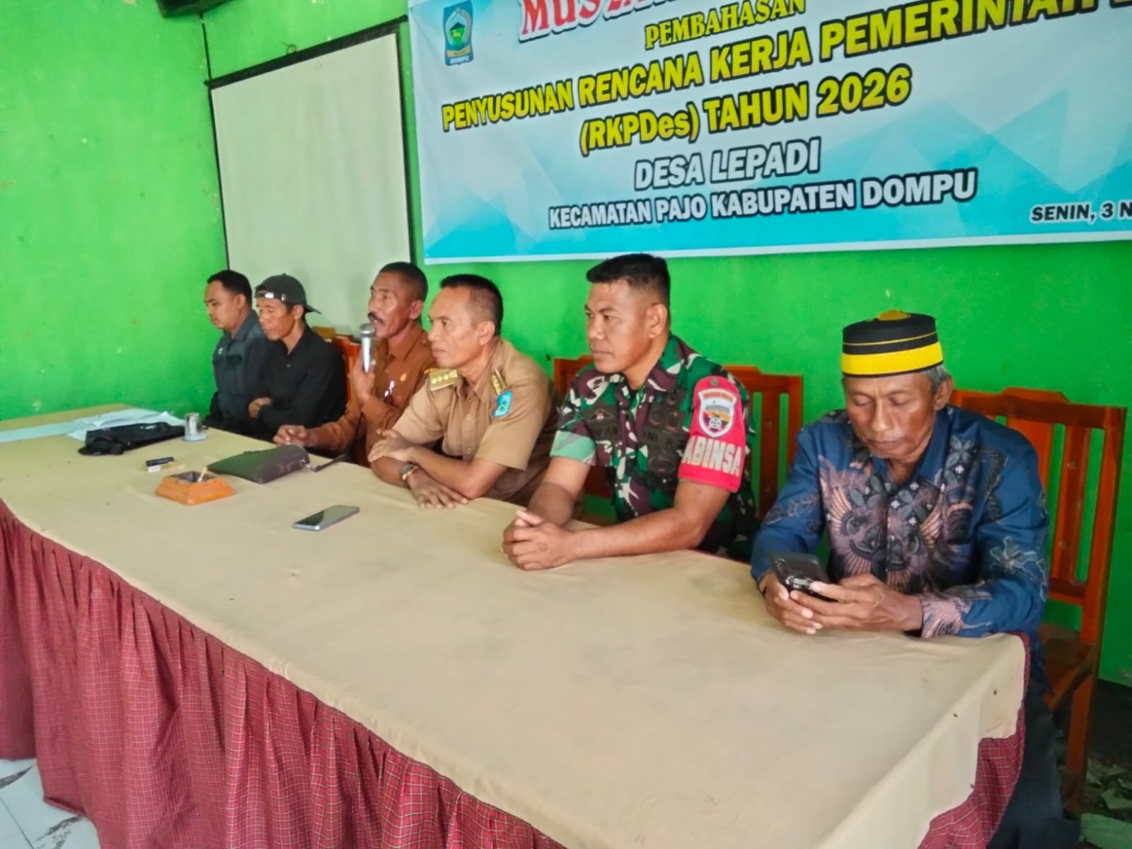 Dompu, NTB — 4 November 2025 Babinsa Koramil 1614-03/Huu, Sertu Ruslan, melaksanakan komunikasi sosial (komsos) dalam rapat Rencana Kerja Pemerintah Desa (RKPDes) 2026 di Aula Kantor Desa Lepadi, Selasa pagi.