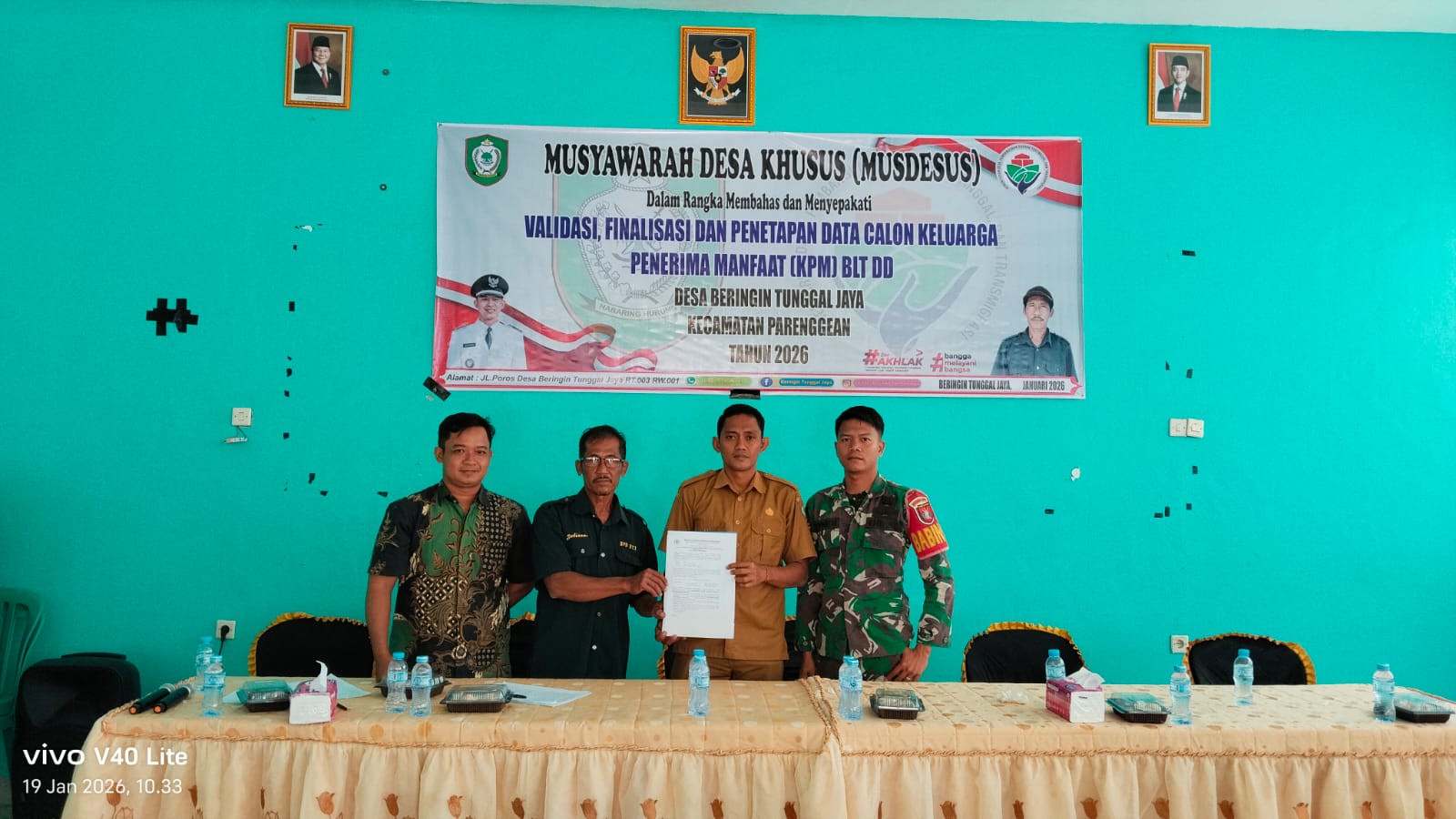 Kotawaringin Timur, 19 Januari 2026 – Dalam upaya memastikan bantuan sosial tepat sasaran, Babinsa Koramil 1015-07/Parenggean, Pratu Ponidi, berpartisipasi dalam Musyawarah Desa (Musdes) di Desa Beringin Tunggal Jaya, Kecamatan Parenggean. Kegiatan ini bertujuan untuk menetapkan Keluarga Penerima Manfaat (KPM) untuk Bantuan Langsung Tunai Dana Desa (BLT-DD) untuk triwulan pertama dan kedua tahun anggaran 2026.