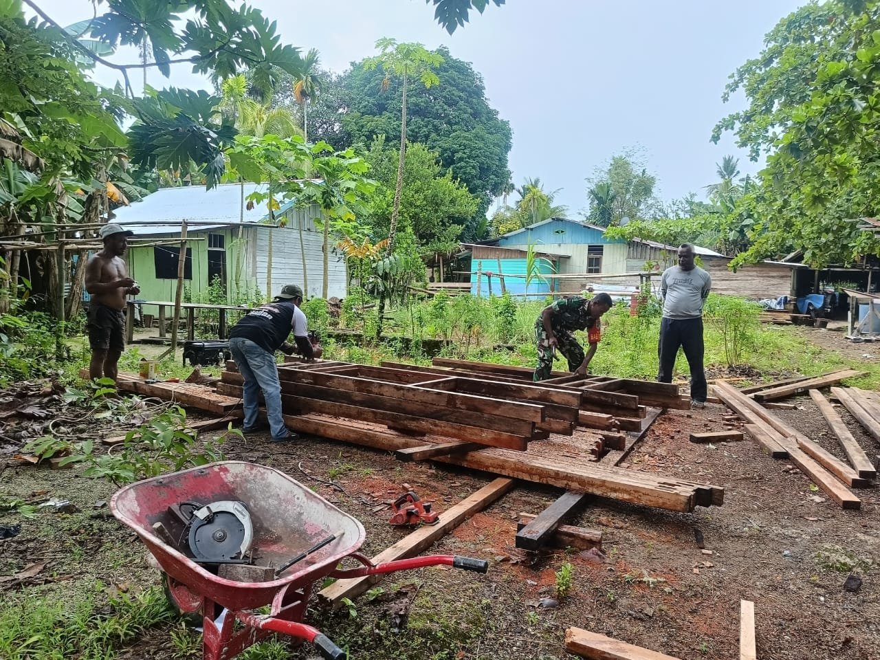 Makimi – Tingkatkan kerja sama dan solidaritas yang tinggi, Babinsa Koramil 1705-02/Napan Serka Esaul Maniawasi membantu dalam pembangunan rumah warga binaannya di Kampung Mosan Distrik Napan Kab. Nabire, Sabtu 27 September 2025