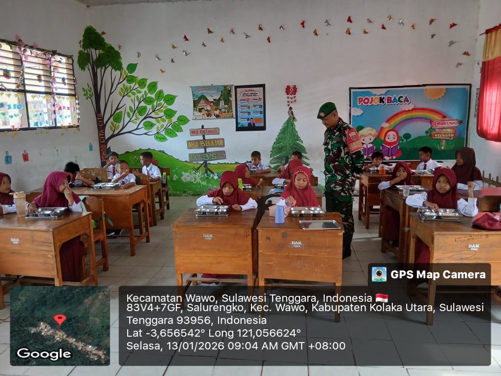 Kolaka Utara – Pada Selasa, 13 Januari 2026, Babinsa dari Koramil 1412-08/Ranteangin, Praka Ismail, melaksanakan kegiatan pemantauan dalam program Makan Bergizi Gratis (MBG) di Kecamatan Wawo. Kegiatan ini bertujuan untuk mendukung program pemerintah dalam meningkatkan gizi anak-anak di sekolah.