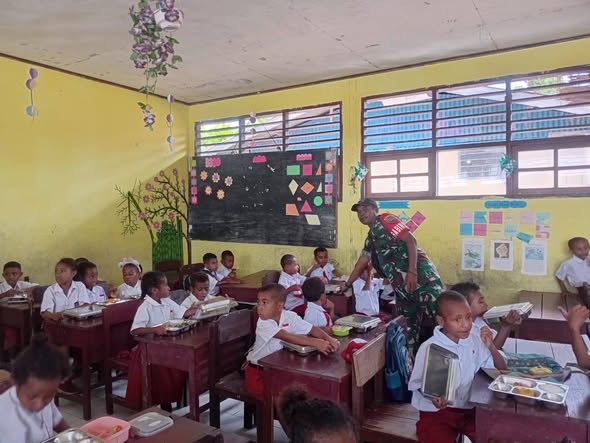 Yapen – Sebagai upaya mendukung kelancaran program Makan Bergizi Gratis (MBG), Babinsa dari Koramil 1709-01/Serui, Serka Tahir Karubaba, melakukan monitoring serta pendampingan kegiatan MBG di beberapa sekolah di Distrik Angkaisera, Kabupaten Kepulauan Yapen pada Senin (08/02/2026).