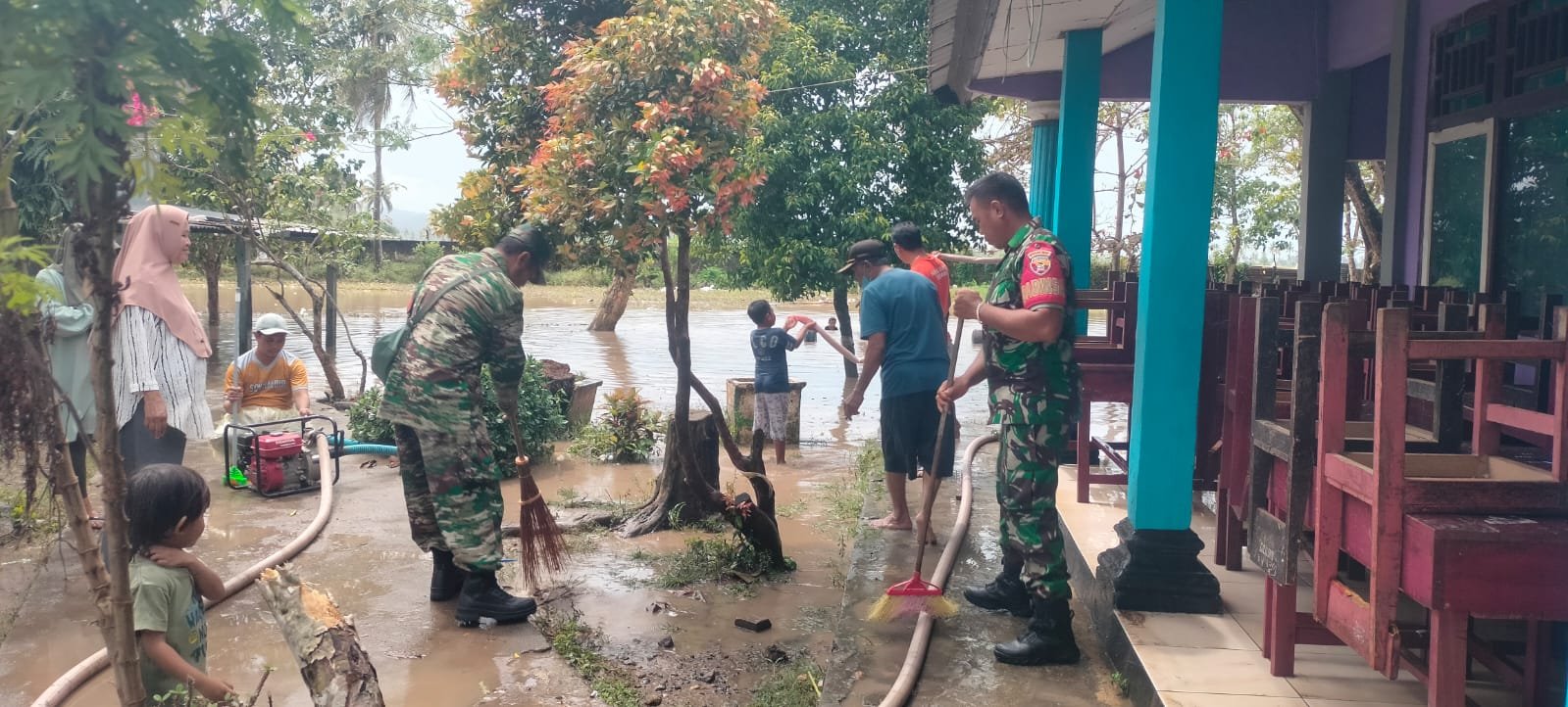 Babinsa Desa Emang Lestari, Serda Nurhadi, bersama anggota Koramil 1607-07/Lunyuk langsung turun ke lokasi membantu warga membersihkan rumah-rumah yang terdampak serta membuka saluran air agar aliran dapat mengalir ke parit.