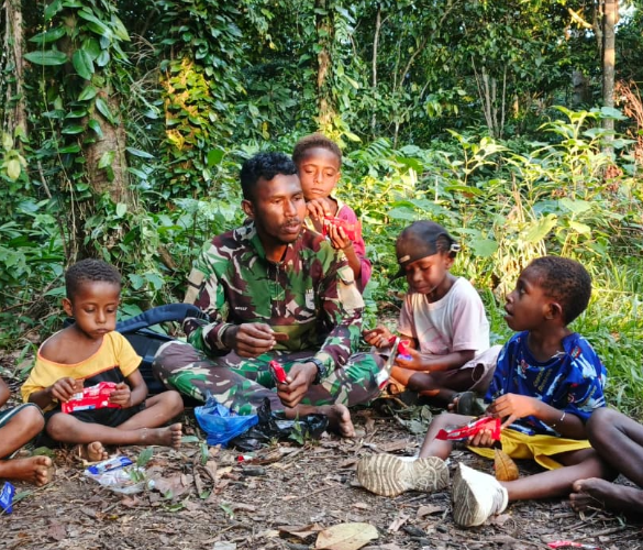 Manokwari Utara — Kegiatan berbagi makanan ringan yang dilakukan Satgas TMMD ke-128 Kodim 1801/Manokwari menjadi salah satu bentuk nyata kemanunggalan TNI dengan rakyat.