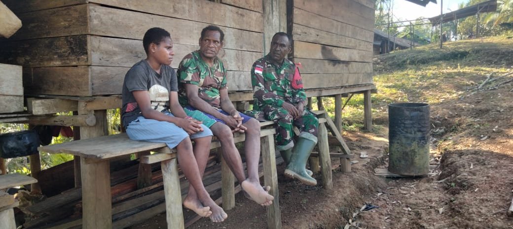Komandan Satuan Setingkat Kompi (SSK) TMMD ke-126, Kapten Inf Melianus Momay, secara aktif melaksanakan komsos bersama warga, seperti terlihat dalam perbincangan santai di teras rumah panggung warga.