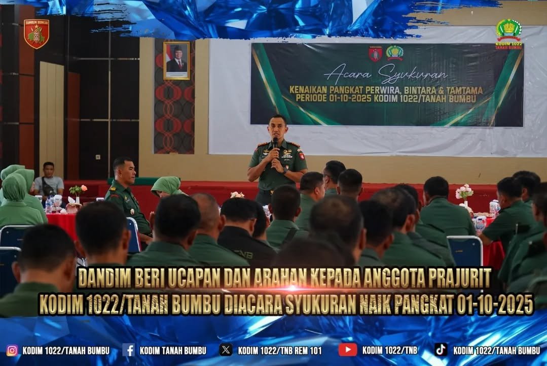 Tanah Bumbu – Komandan Kodim 1022/Tanah Bumbu, Letkol Inf Zierda Aulia Salam, S.Hub.Int., M.H.I., memberikan ucapan selamat dan arahan kepada para anggota yang menerima kenaikan pangkat periode 1 Oktober 2025. Acara syukuran tersebut berlangsung khidmat di Aula Makodim 1022/Tanah Bumbu.