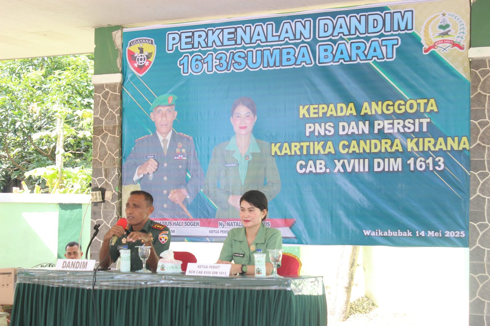 SUMBA BARAT – Komandan Kodim 1613/Sumba Barat, Letkol Inf Ignasius Hali Sogen, S.E., bersama Ketua Persit KCK Cabang XVIII Kodim 1613/Sumba Barat, Ny. Natalia Ignasius, tatap muka dan perkenalan bersama seluruh prajurit, PNS, dan anggota Persit Kodim 1613/Sumba Barat di Aula Terbuka Makodim, Rabu (14/5/2025).