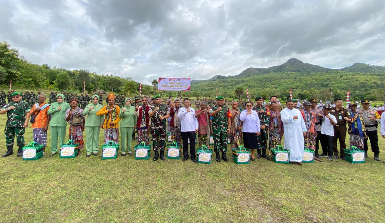 Kefamenanu, NTT – Dalam rangkaian Upacara Penutupan TMMD Ke-127 yang diadakan di Desa Sunkaen, Kecamatan Bikomi Nilulat, Kabupaten Timor Tengah Utara (TTU) pada Rabu (11/03/2026), Danrem 161/Wira Sakti Brigjen TNI Hendro Cahyono, didampingi Ketua Persit KCK Koorcab Rem 161 PD IX/Udayana Ny. Kartika Adiningtyas Cahyono, melaksanakan pembagian bantuan sembako kepada warga setempat.