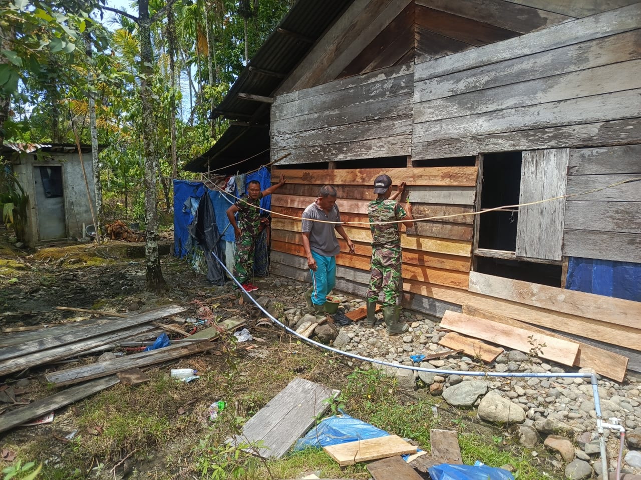 Di titik kedua perehaban, Satgas TMMD bersama warga bahu-membahu mengganti papan dinding yang telah lapuk. Tidak ada sekat antara seragam loreng dan pakaian kerja warga. Semua menyatu dalam tujuan yang sama.