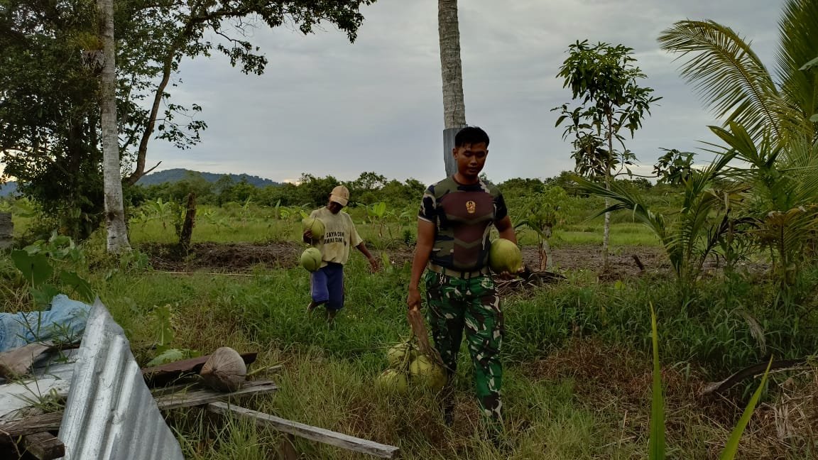 Dekat dengan Rakyat, Satgas TMMD ke-124 Bantu Warga Panen Kelapa Muda di Sungai Purun Kecil