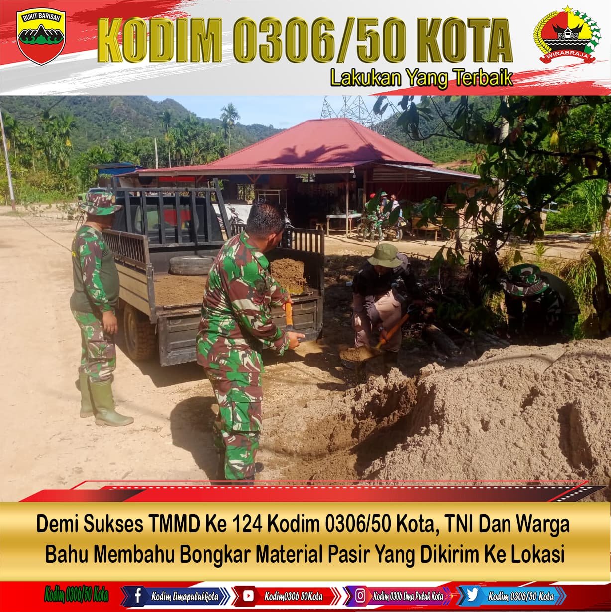 Demi Sukses TMMD Ke 124 Kodim 0306/50 Kota, TNI Dan Warga Bahu Membahu Bongkar Material Pasir Yang Dikirim Ke Lokasi