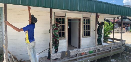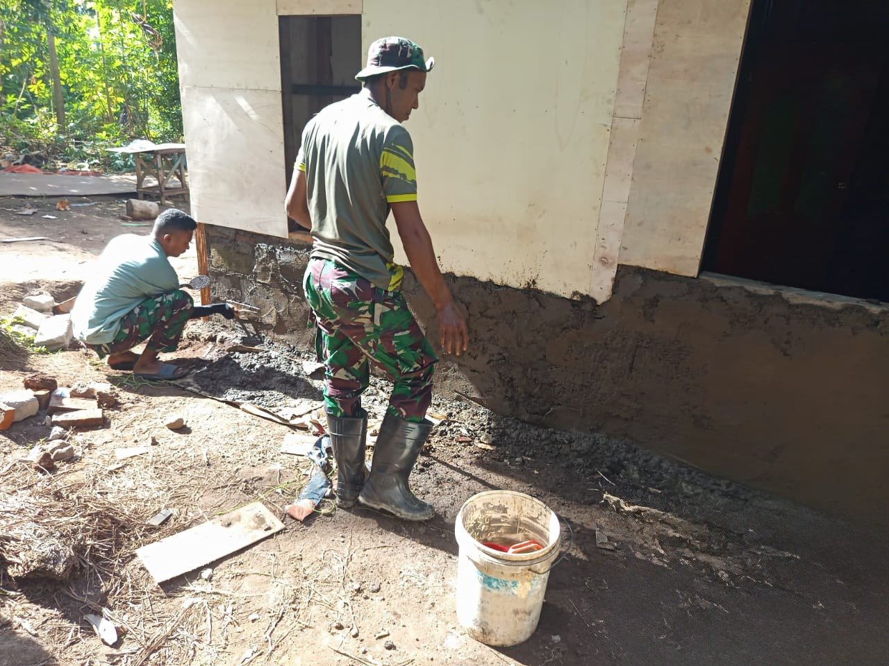 Terlihat dengan semangat para Satgas TMMD mengerjakan plester dinding rumah milik Florianus, penerima manfaat dalam program sasaran fisik TMMD