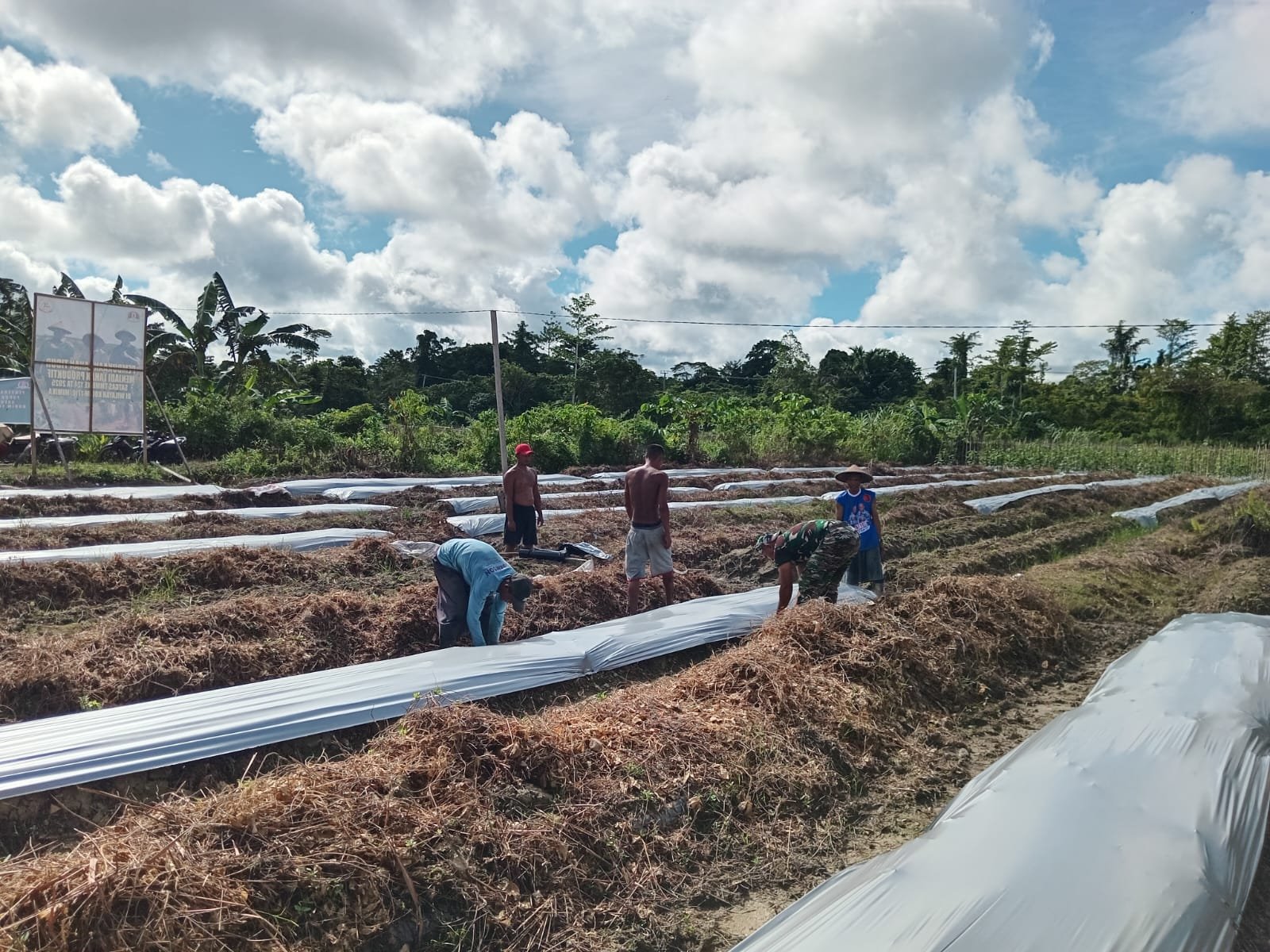 Mimika – Wujud nyata kepedulian TNI terhadap ketahanan pangan kembali ditunjukkan melalui program TNI Manunggal Membangun Desa (TMMD) ke-124 Kodim 1710/Mimika. Kamis (22/5/2025), Satgas TMMD bersama warga melaksanakan pemasangan plastik mulsa di area pertanian yang sebelumnya tidak tergarap di Kampung SP6, Distrik Iwaka, Kabupaten Mimika.