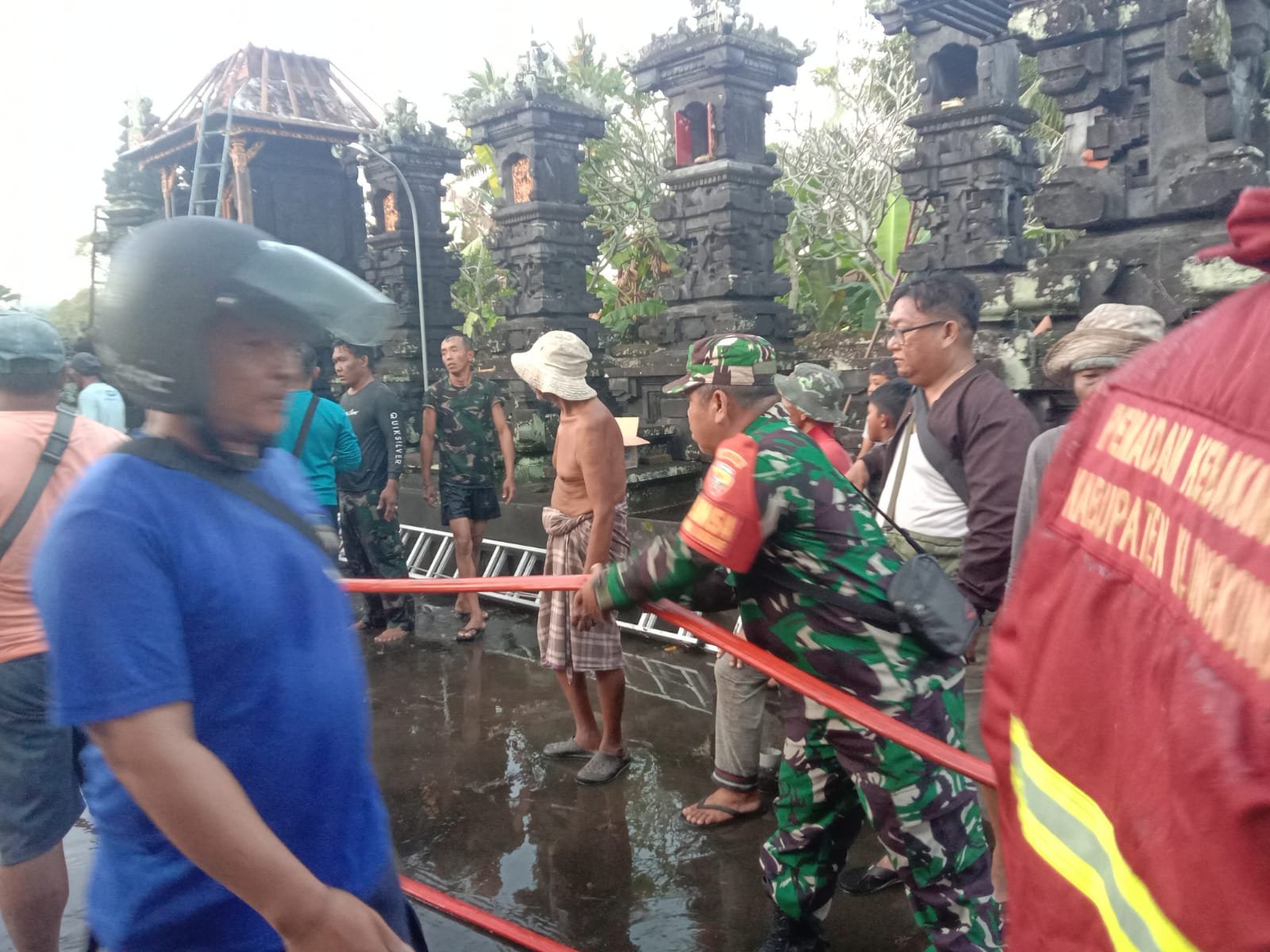 Gerak Cepat, Babinsa Getakan Bersinergi Padamkan Kebakaran Di Pura Penataran Pande Meranggi