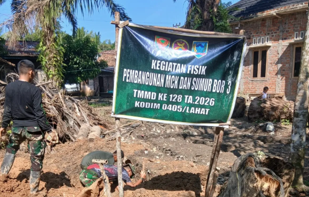 Lahat — Gerak cepat (gercep) ditunjukkan Satgas TNI Manunggal Membangun Desa (TMMD) ke-128 Kodim 0405/Lahat dalam menghadirkan fasilitas bagi masyarakat. Setelah berhasil menemukan sumber air bersih melalui pengeboran sumur, pembangunan sarana mandi, cuci, kakus (MCK) langsung dikerjakan di Desa Lubuk Tampang, Kecamatan Kikim Timur, Kabupaten Lahat.