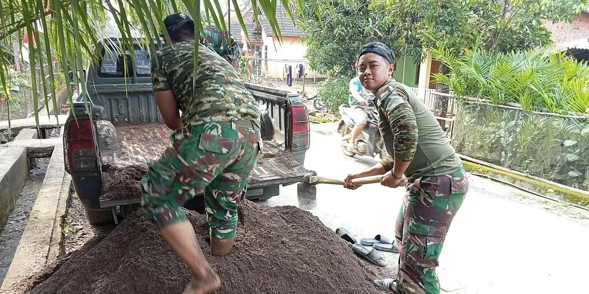 Di Desa Lubuk Tampang, Kecamatan Kikim Timur, Kabupaten Lahat, anggota Satgas TMMD terlihat bekerja keras mengangkut material pasir dari kendaraan sebagai bahan utama pembangunan. Kegiatan tersebut dilakukan bersama warga setempat dalam suasana kebersamaan yang kental.