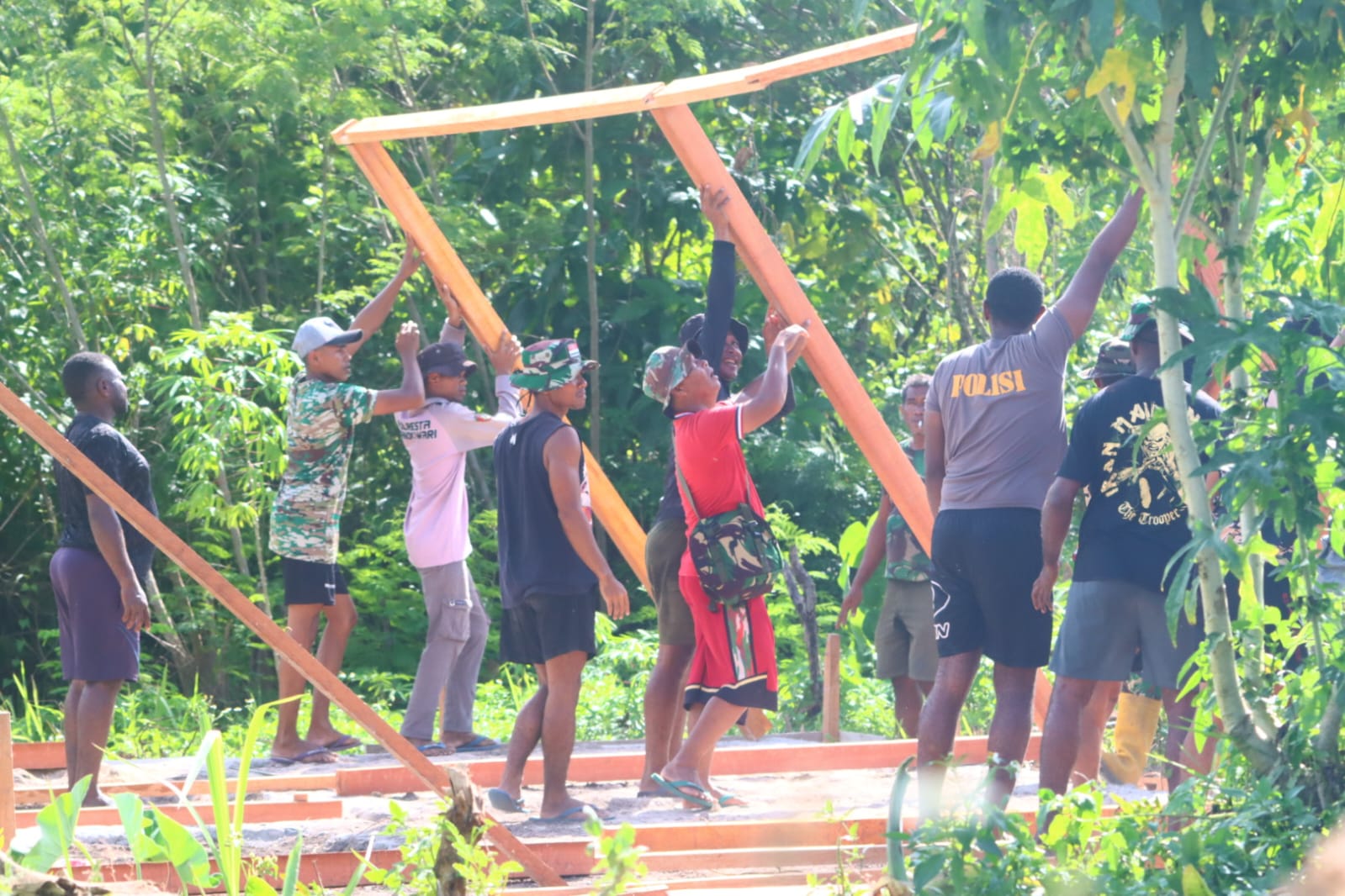 Sejak pagi hari, anggota Satgas bersama warga dan tukang bekerja bahu-membahu memulai pembangunan dari tahap pondasi. Tidak hanya mengandalkan tenaga Satgas, masyarakat juga turut aktif membantu dalam setiap proses pekerjaan.