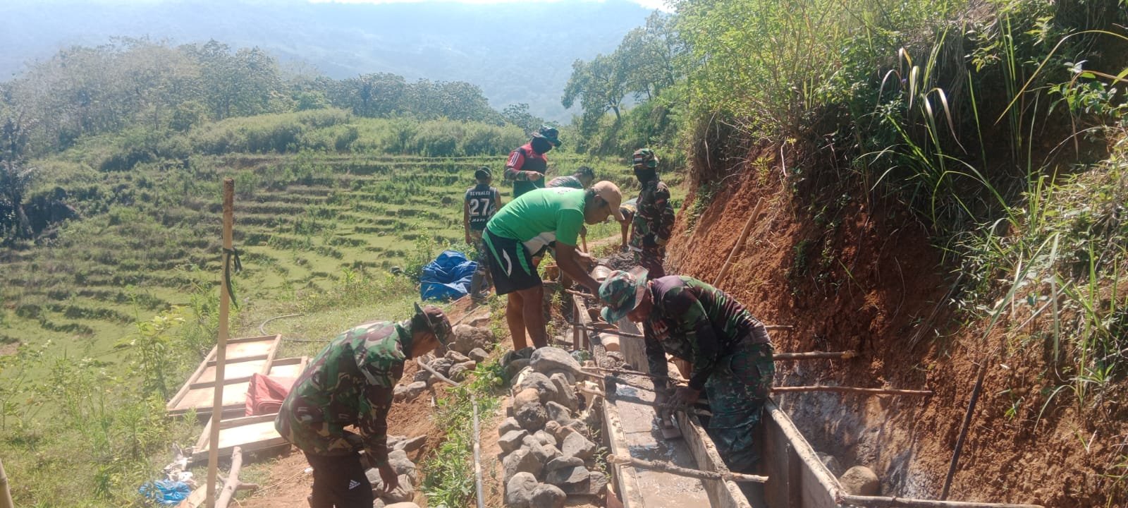 Pekerjaan di lapangan dilakukan di bawah terik matahari dengan penuh semangat. Personel TNI bersama puluhan warga saling membantu mengangkut batu, mencampur semen, dan melakukan pengecoran sepanjang ratusan meter.