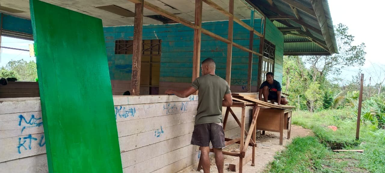 Boven Digoel – Dengan semangat kebersamaan, Satgas TMMD ke-126 Kodim 1711/Boven Digoel bersama masyarakat Kampung Waropko melaksanakan rehabilitasi Balai Kampung yang menjadi salah satu sasaran tambahan dalam program TMMD.