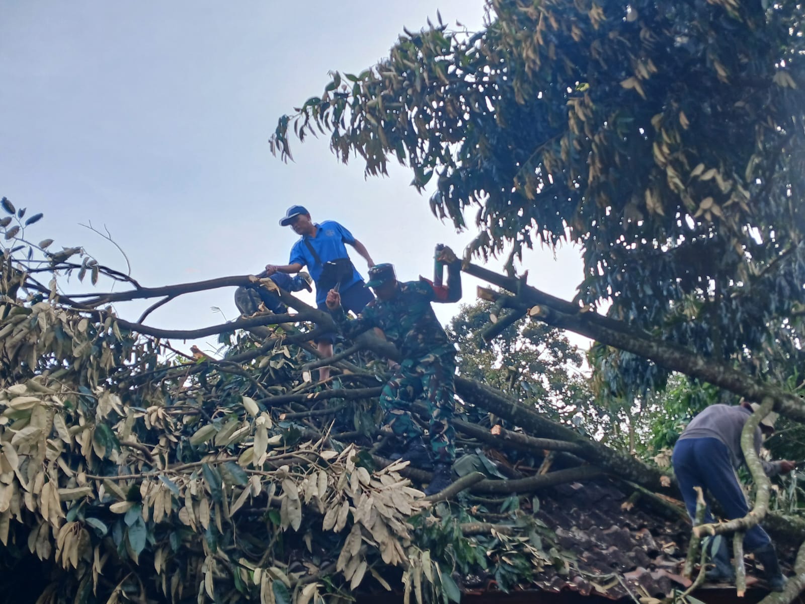 Menanggapi situasi yang berpotensi membahayakan, Babinsa dan warga setempat bergegas melakukan evakuasi dengan cara memotong dan membersihkan batang serta ranting pohon. Kegiatan ini dilakukan secara gotong royong menggunakan alat seadanya, dengan tetap mengutamakan aspek keamanan demi keselamatan bersama.