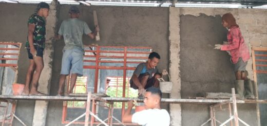 Kerja sama antara Satgas dan masyarakat berjalan harmonis. Mereka saling membantu mulai dari persiapan material hingga proses penancapan cerucuk di sepanjang trase jalan yang sudah ditentukan.