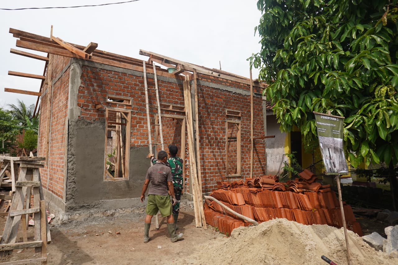 Pesawaran — Proyek TNI Manunggal Membangun Desa (TMMD) Ke-127 yang dilaksanakan oleh Kodim 0421/Lampung Selatan kembali memberikan harapan bagi masyarakat berpenghasilan rendah di Desa Tanjung Rejo, Kecamatan Way Khilau, Kabupaten Pesawaran. Saat ini, rehabilitasi Rumah Tidak Layak Huni (RTLH) milik Bapak Suhono telah mencapai tahap pemasangan kuda-kuda atap dan plester dinding depan.