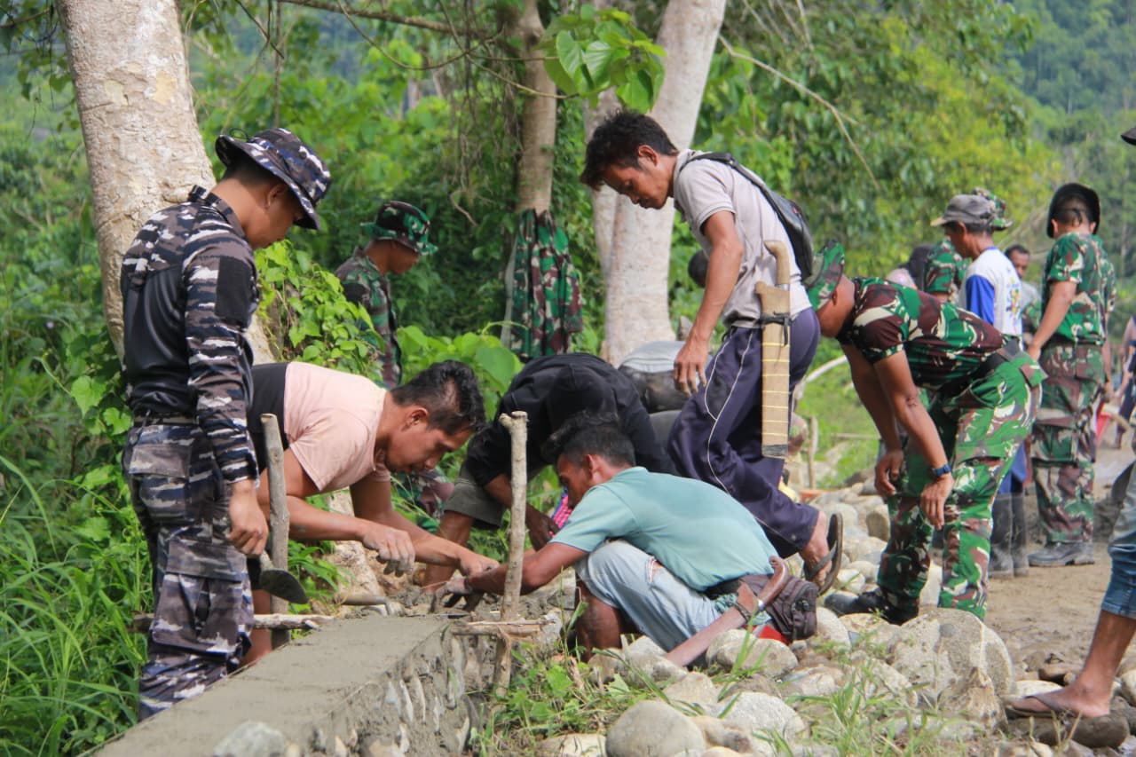 Terlihat personel Satgas TMMD bekerja sama dengan masyarakat setempat dalam melaksanakan proyek ini. Proses mulai dari pengangkutan material hingga perataan badan jalan dilakukan secara gotong royong, mencerminkan soliditas antara TNI dan masyarakat.