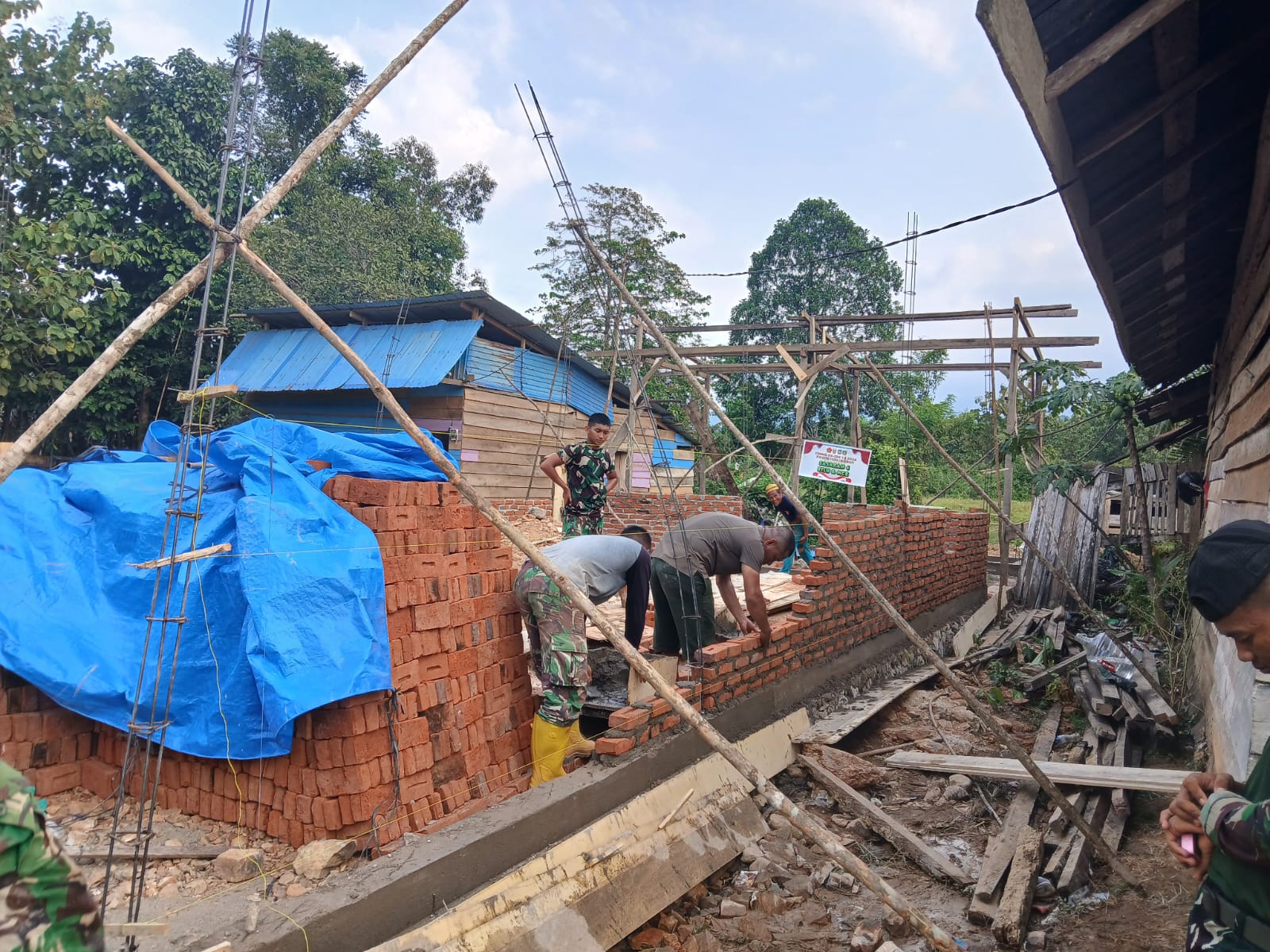 Sersan Fandrianto sendiri tampak sigap mengatur jalannya pekerjaan. Dengan gaya santai tapi tegas, ia sesekali ikut bercanda dengan warga agar suasana tetap hidup. “Yang penting rumah jadi, hati juga senang,” katanya.