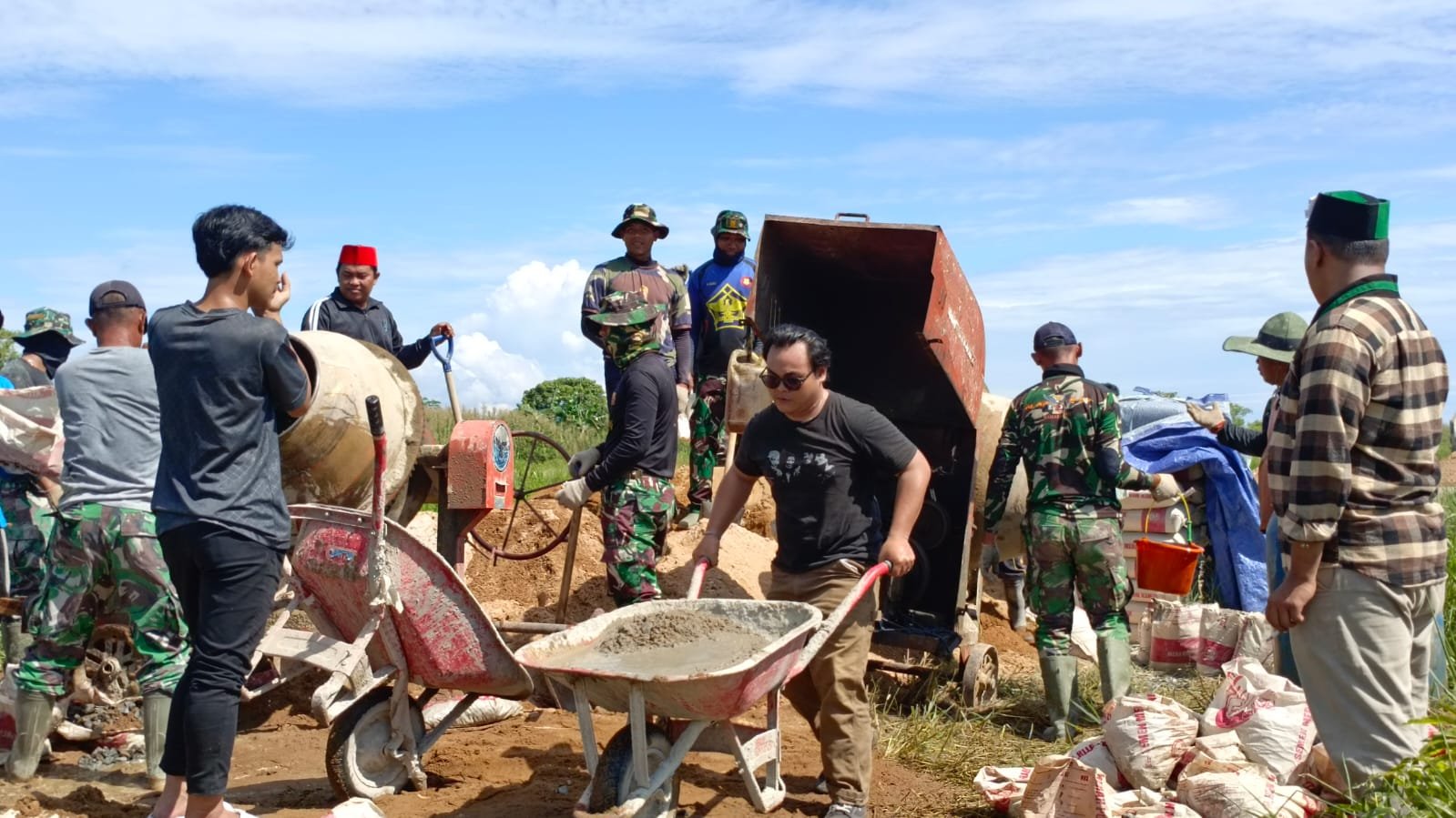 Meski cuaca terik menyengat dan suhu udara mencapai titik tertingginya, semangat para mahasiswa tidak surut. Mereka bahu membahu bersama prajurit TNI melangsir material dan meratakan adukan semen demi mempercepat pembangunan infrastruktur jalan desa yang menjadi bagian dari program TMMD Reguler tahun ini.