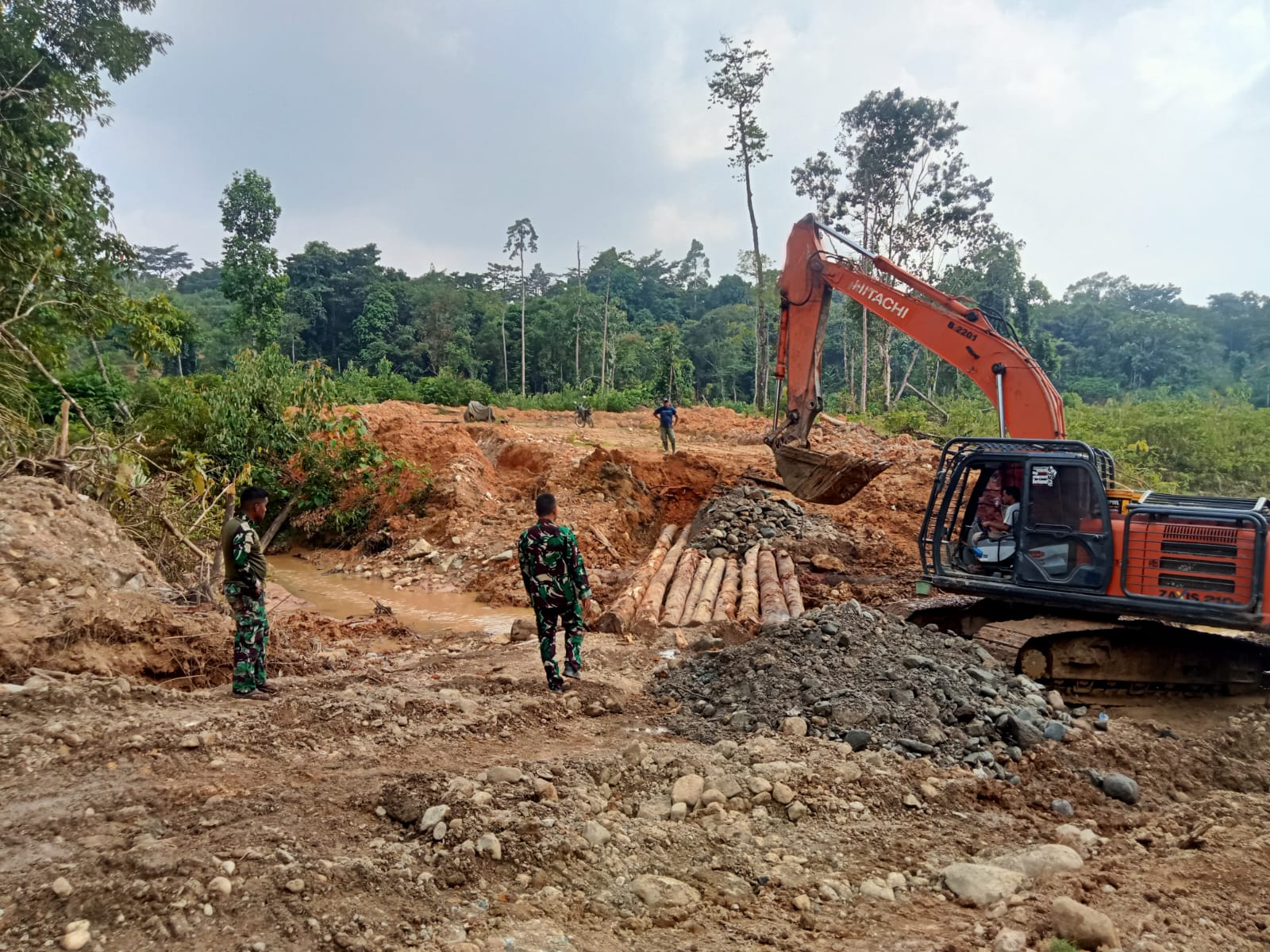 “Di lokasi ini kami sedang mengerjakan drainase sekaligus jembatan darurat. Materialnya menggunakan batang pohon yang kuat dan sudah dipilih secara khusus agar dapat menopang beban kendaraan nantinya,” ungkapnya.