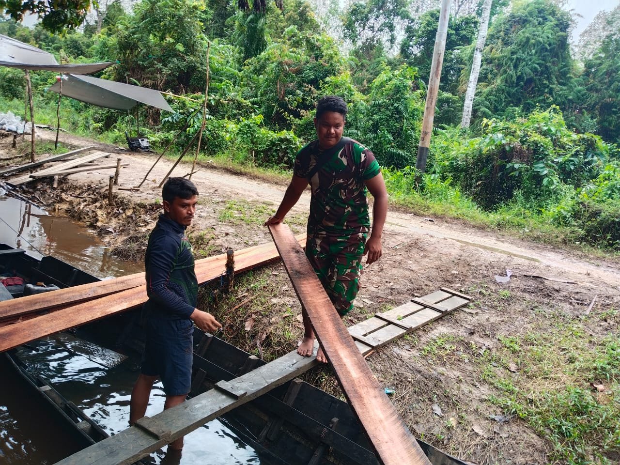 Meski menghadapi tantangan alam seperti medan licin dan sungai yang harus diseberangi, para prajurit tetap bekerja keras membawa material seperti kayu, pasir, batu, dan semen ke lokasi pembangunan.
