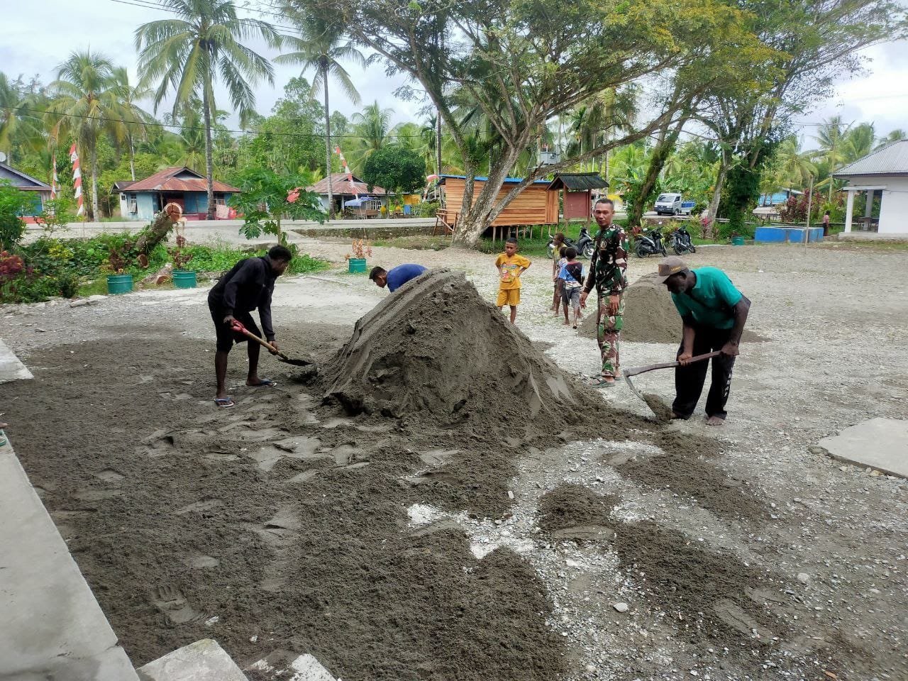 Sejak pagi hari, warga dan anggota TNI tampak antusias melaksanakan gotong royong. Mereka melakukan penimbunan pasir dan perapihan area lapangan agar layak digunakan untuk acara yang direncanakan, seperti makan bersama, pembagian paket sembako, serta pelayanan kesehatan gratis bagi masyarakat setempat.
