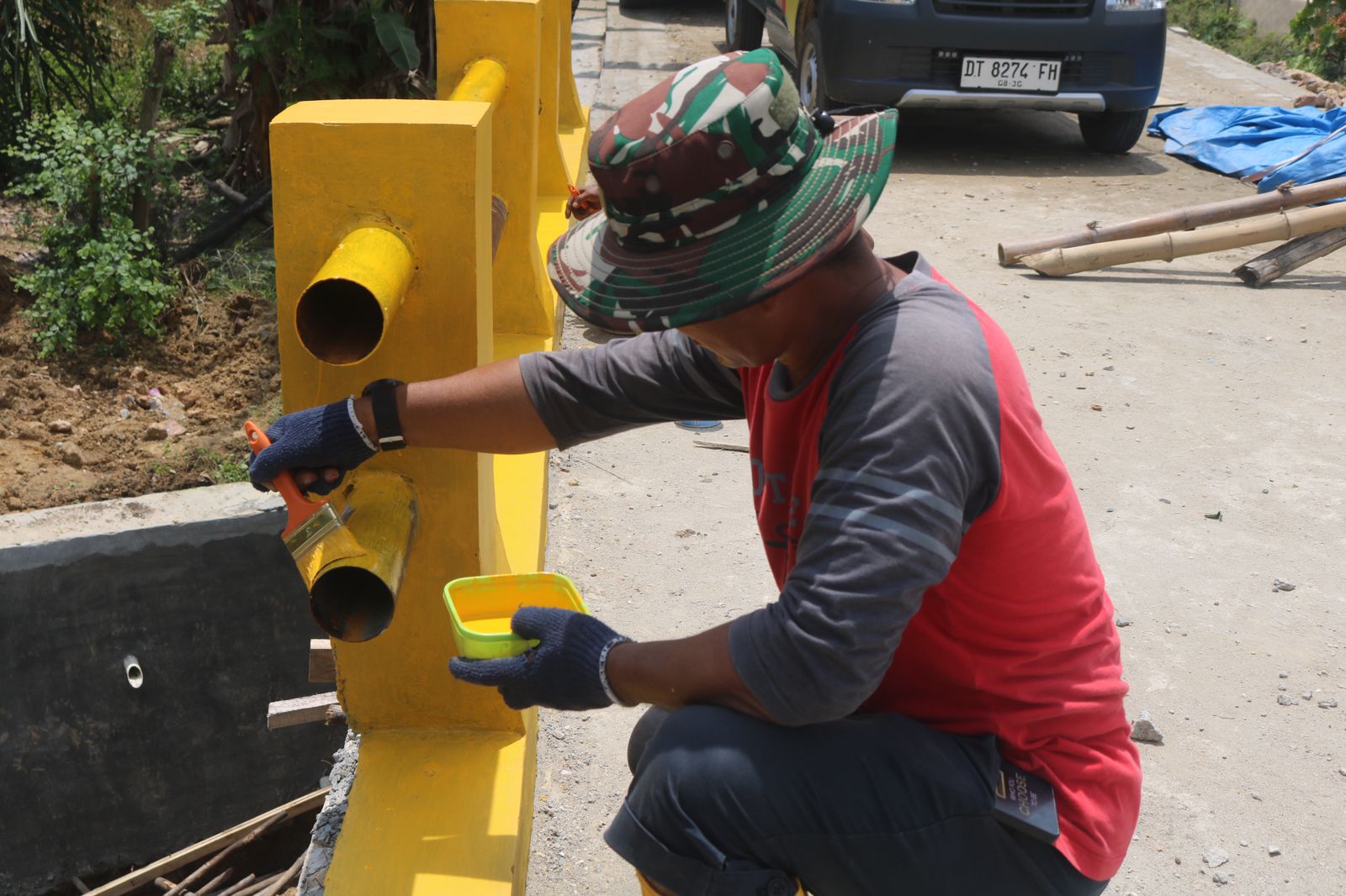Kendari – Program TNI Manunggal Membangun Desa (TMMD) ke-127 yang dilaksanakan oleh Kodim 1417/Kendari telah membawa perubahan signifikan bagi masyarakat di Kelurahan Anggoeya. Salah satu langkah yang diambil dalam program ini adalah pengecatan pagar jembatan dengan warna-warna cerah, yang bertujuan untuk meningkatkan estetika sekaligus keamanan bagi pengguna jalan. Warna-warna terang yang diaplikasikan pada pagar jembatan juga berfungsi sebagai penanda visual, sehingga jembatan lebih mudah terlihat terutama bagi pengendara yang melintas pada malam hari. Kehadiran Satgas TMMD di tengah masyarakat Anggoeya disambut positif oleh warga, yang telah lama menantikan adanya perbaikan infrastruktur tersebut. Dengan penampilan jembatan yang lebih menarik dan aman, diharapkan mobilitas masyarakat di wilayah tersebut menjadi lebih baik, mendukung kenyamanan dan aktivitas ekonomi warga Kelurahan Anggoeya.