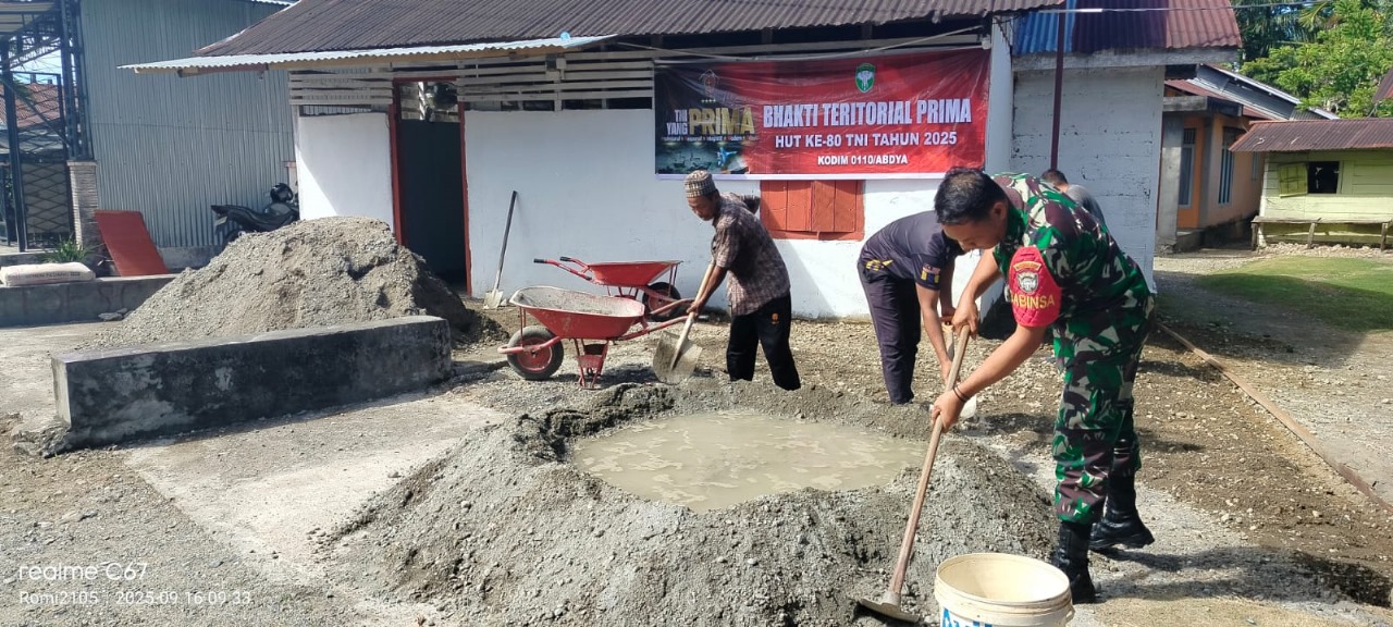 ABDYA – Dalam rangka menyambut Hari Ulang Tahun ke-80 Tentara Nasional Indonesia (TNI), personel Kodim 0110/Aceh Barat Daya (Abdya) bersama masyarakat melaksanakan kegiatan pengecoran (semenisasi) di Dayah Nur Nyak Dah, Desa Gunung Cut, Kecamatan Tangan-Tangan, Selasa (16/9/2025).